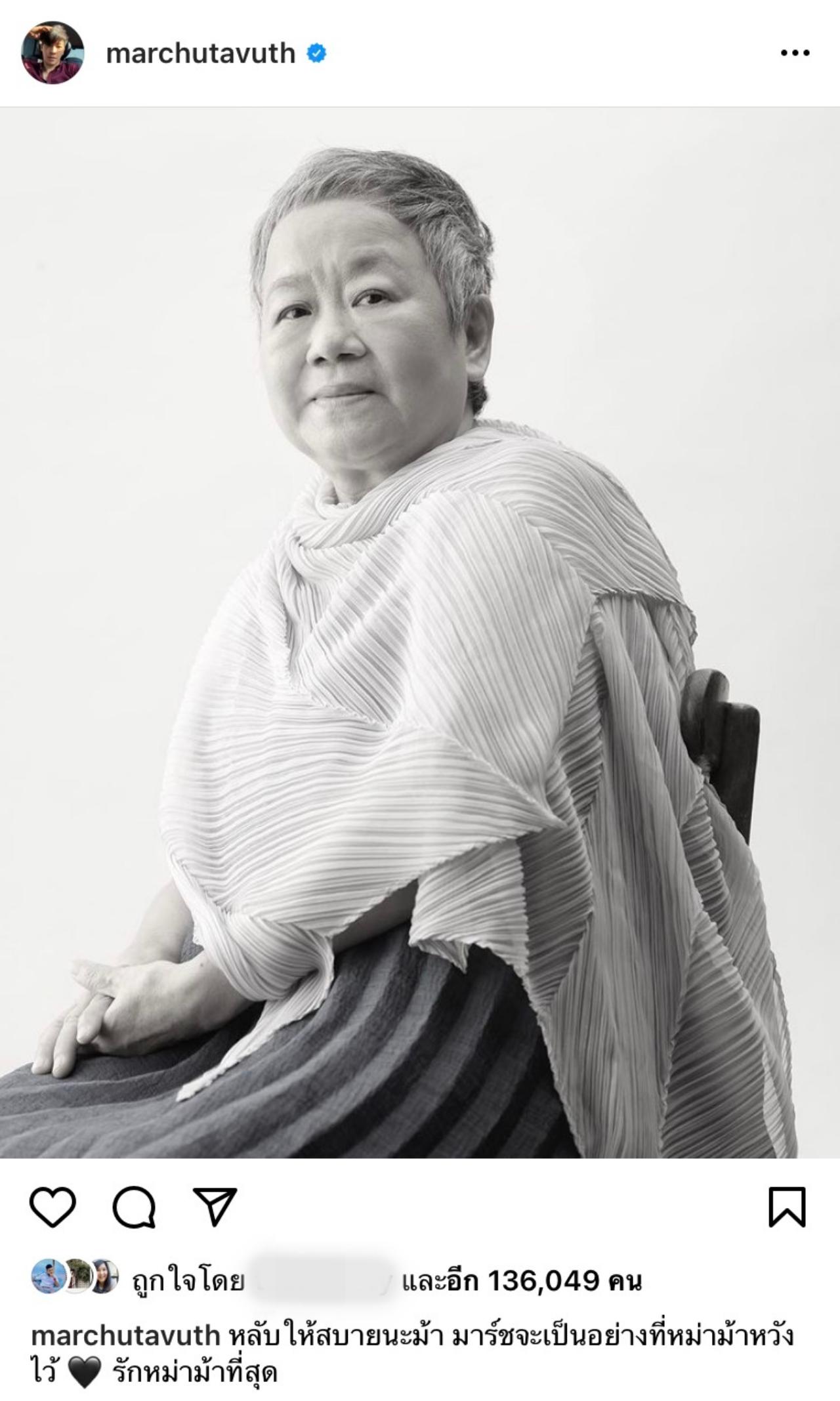 ซึ่งหนุ่ม มาร์ช จุฑาวุฒิ ได้โพสต์รูปคุณแม่สุดที่รักในเช้าวันนี้ (26 พ.ย.63) พร้อมข้อความว่า "หลับให้สบายนะม้า มาร์ชจะเป็นอย่างที่หม่าม้าหวังไว้ รักหม่าม้าที่สุด" ซึ่งก็มีเพื่อนพ้องในวงการมาร่วมคอมเมนต์แสดงความอาลัย พร้อมส่งกำลังใจมากมาย