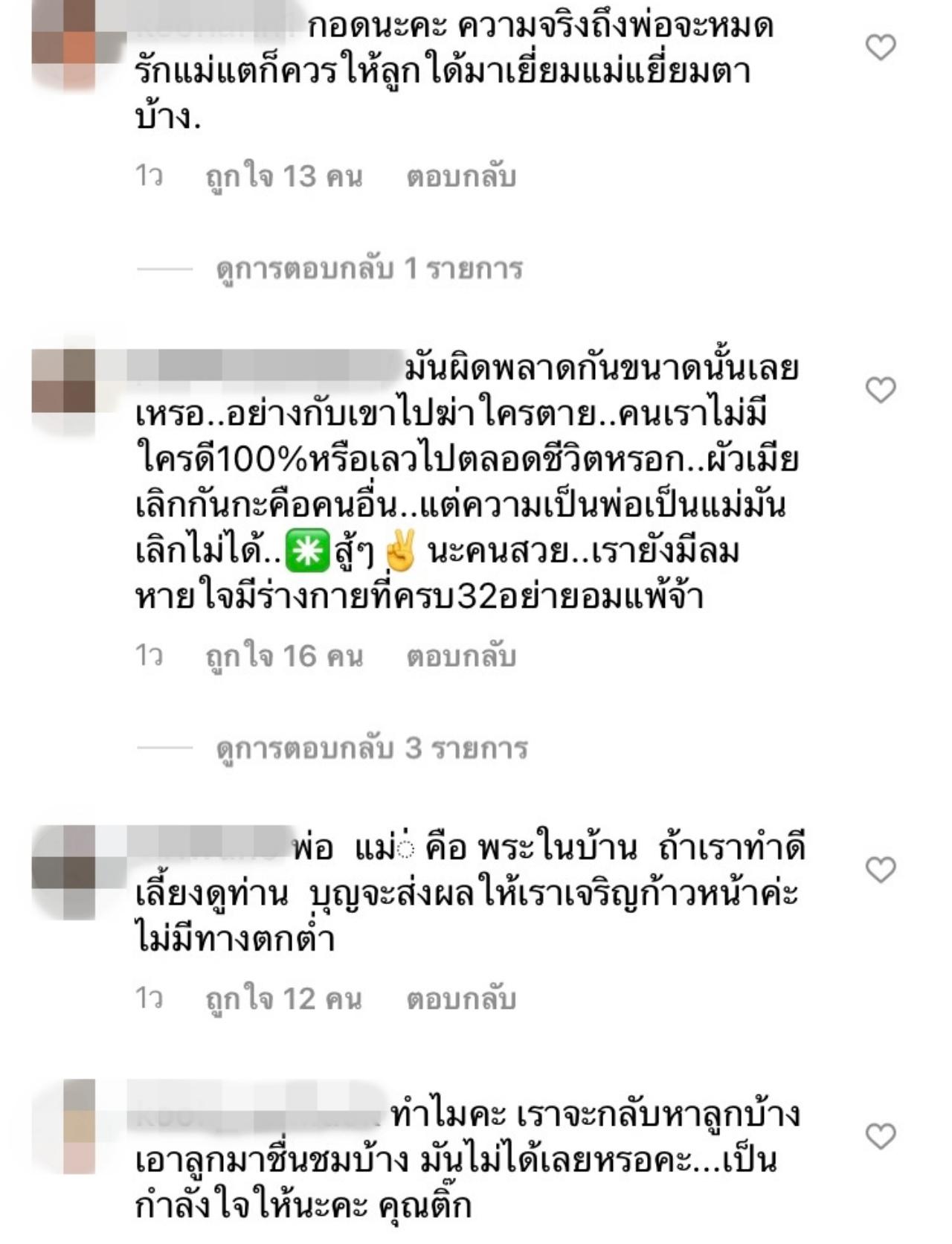 และบางคนก็ถามกลับว่า มันผิดพลาดกันขนาดนั้นเลยเหรอ อย่างกับไปฆ่าใครตาย คนเราไม่มีใครดี 100% หรือดีไปตลอดชีวิตหรอก ผัวเมียถึงเลิกกันแล้วก็เป็นคนอื่น แต่ความเป็นพ่อเป็นแม่มันเลิกไม่ได้ พร้อมกับบอกให้ ติ๊ก สู้ๆ อีกด้วย.