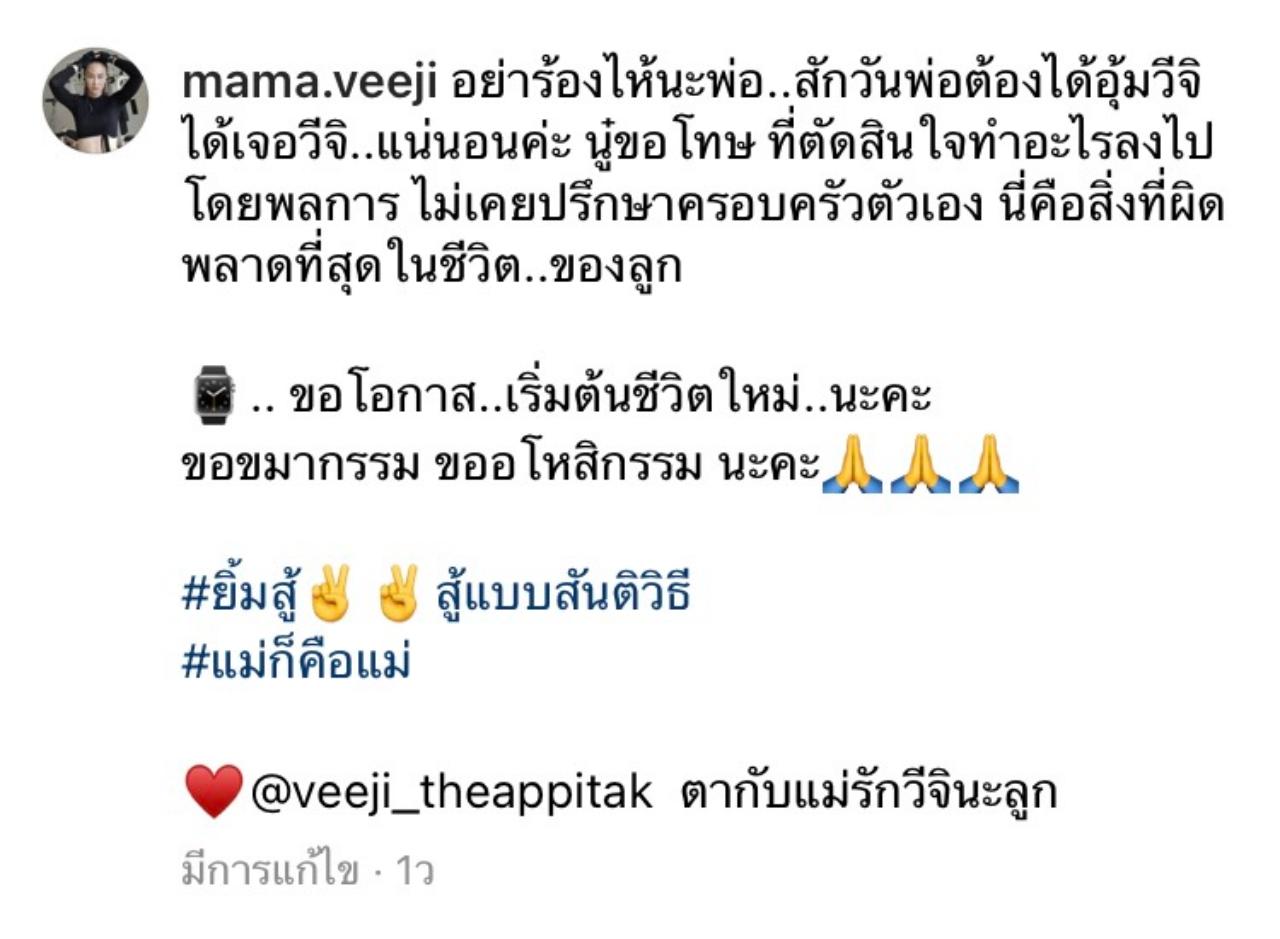 ขอโอกาส..เริ่มต้นชีวิตใหม่..นะคะ ขอขมากรรม ขออโหสิกรรม นะคะ #ยิ้มสู้ สู้แบบสันติวิธี #แม่ก็คือแม่ @veeji_theappitak ตากับแม่รักวีจินะลูก"