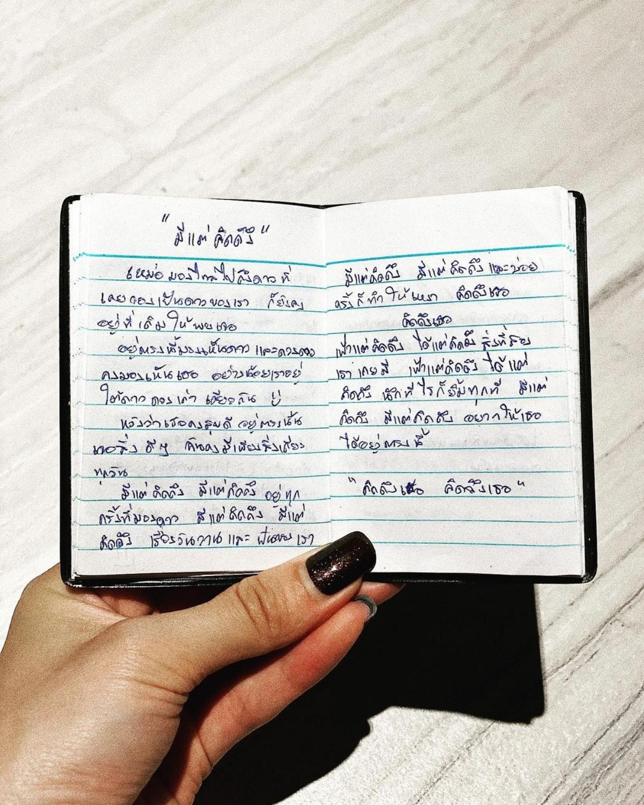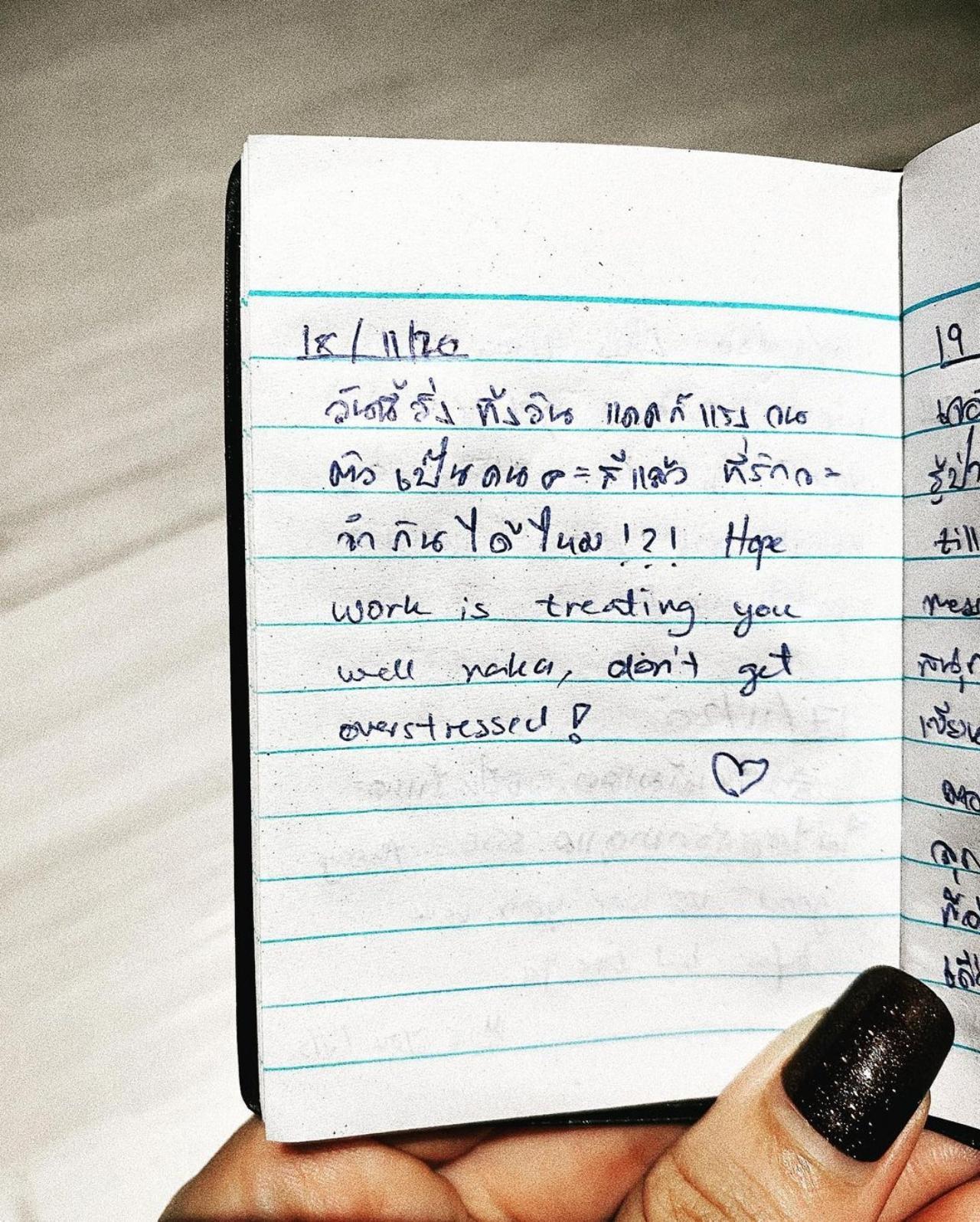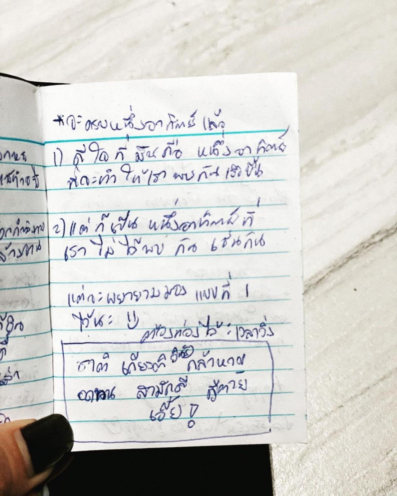 “มีแต่คิดถึง” “วันที่เพลงได้มีโอกาสเข้าไปเยี่ยมเป๊กเป็นครั้งแรกในรอบ 1 เดือน เป๊กได้เอา mini diary ของเป๊กมาให้เพลง ในนั้นมีเรื่องเล่าๆ สั้นของแต่ละวัน มีทั้ง ช่วงเวลาที่ปรับตัว เวลาที่ซ้อมหนัก เวลาที่คิดถึงที่บ้าน