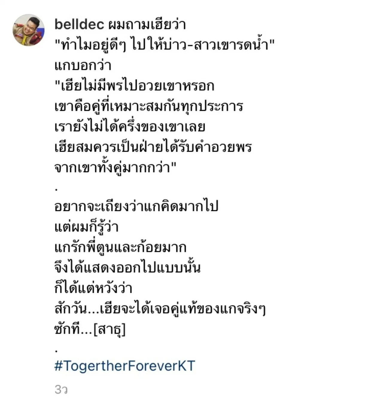 อยากจะเถียงว่าแกคิดมากไป แต่ผมก็รู้ว่า แกรักพี่ตูนและก้อยมาก จึงได้แสดงออกไปแบบนั้น ก็ได้แต่หวังว่า สักวันเฮียจะได้เจอคู่แท้ของแกจริงๆ ซักที [สาธุ] #TogertherForeverKT"
