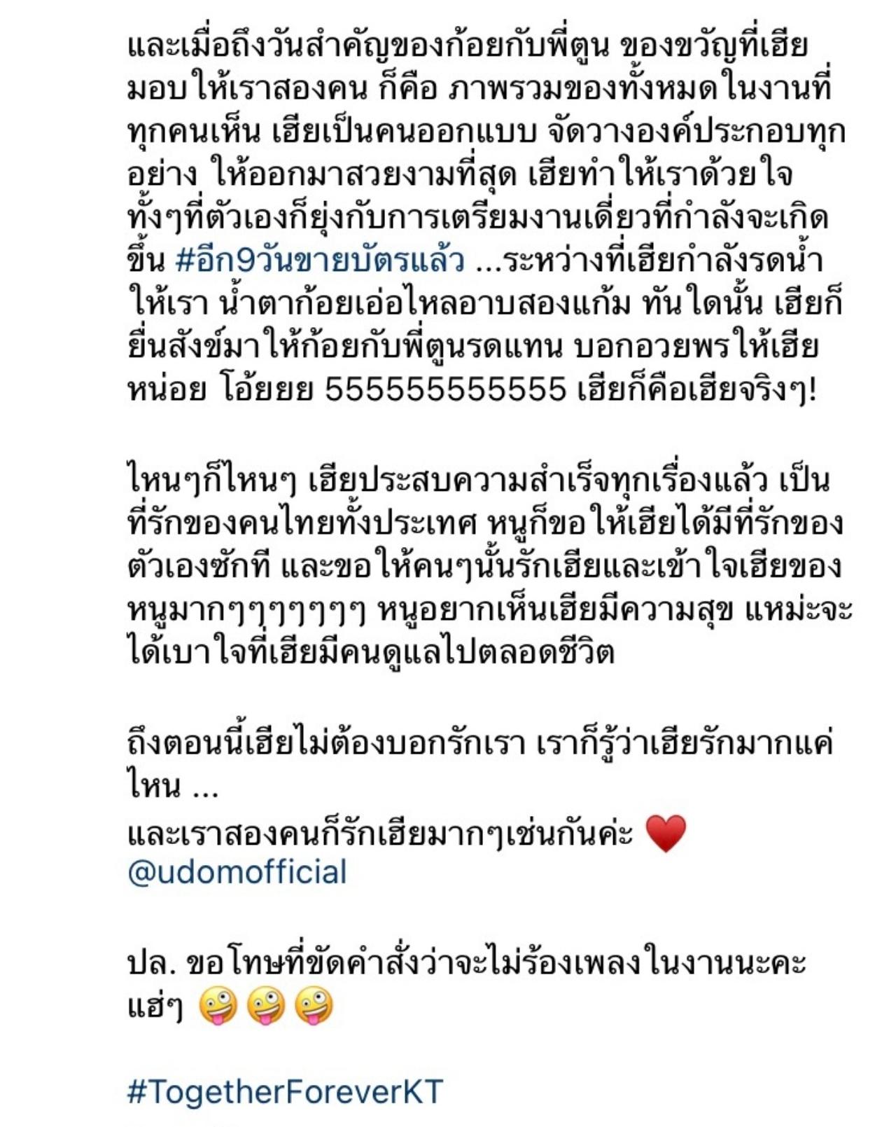 ถึงตอนนี้เฮียไม่ต้องบอกรักเรา เราก็รู้ว่าเฮียรักมากแค่ไหน และเราสองคนก็รักเฮียมากๆเช่นกันค่ะ @udomofficial ปล. ขอโทษที่ขัดคำสั่งว่าจะไม่ร้องเพลงในงานนะคะ แฮ่ๆ #TogetherForeverKT"