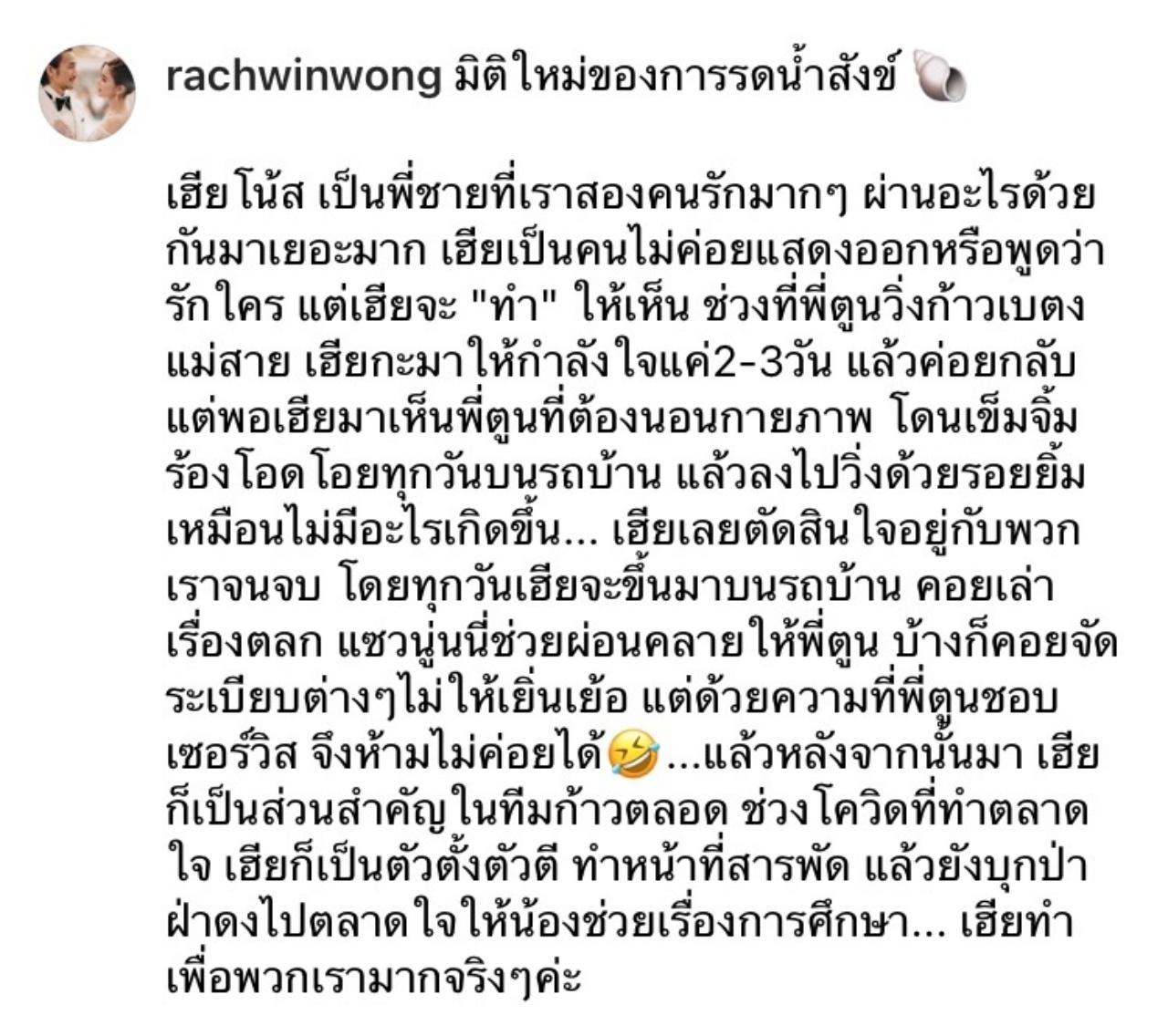 และจากเรื่องนี้เอง เบล ชายชาญ หนึ่งในกำลังสำคัญของทีมก้าว และเป็นอีกหนึ่งคนที่สนิทกับ โน้ส อุดม ก็ได้เขียนอธิบายถึงเหตุการณ์ที่ว่าทำไม โน้ส ถึงต้องให้ ก้อย-ตูน รดน้ำ อวยพรให้ว่า