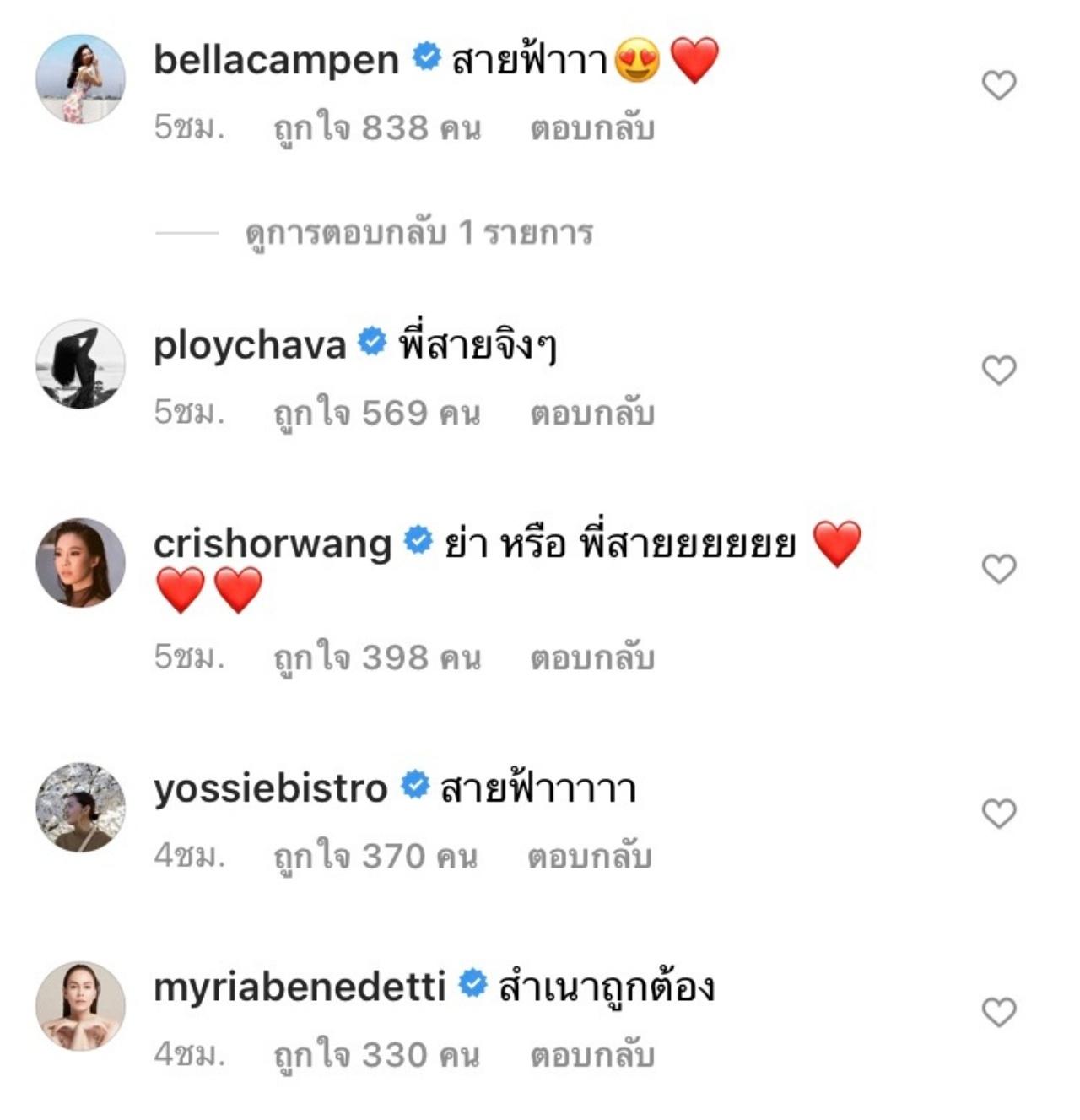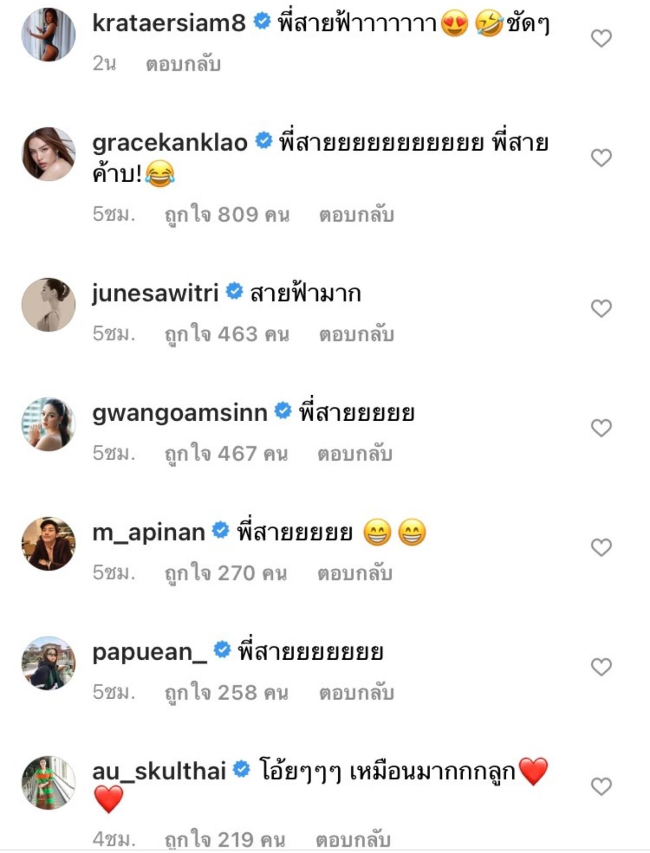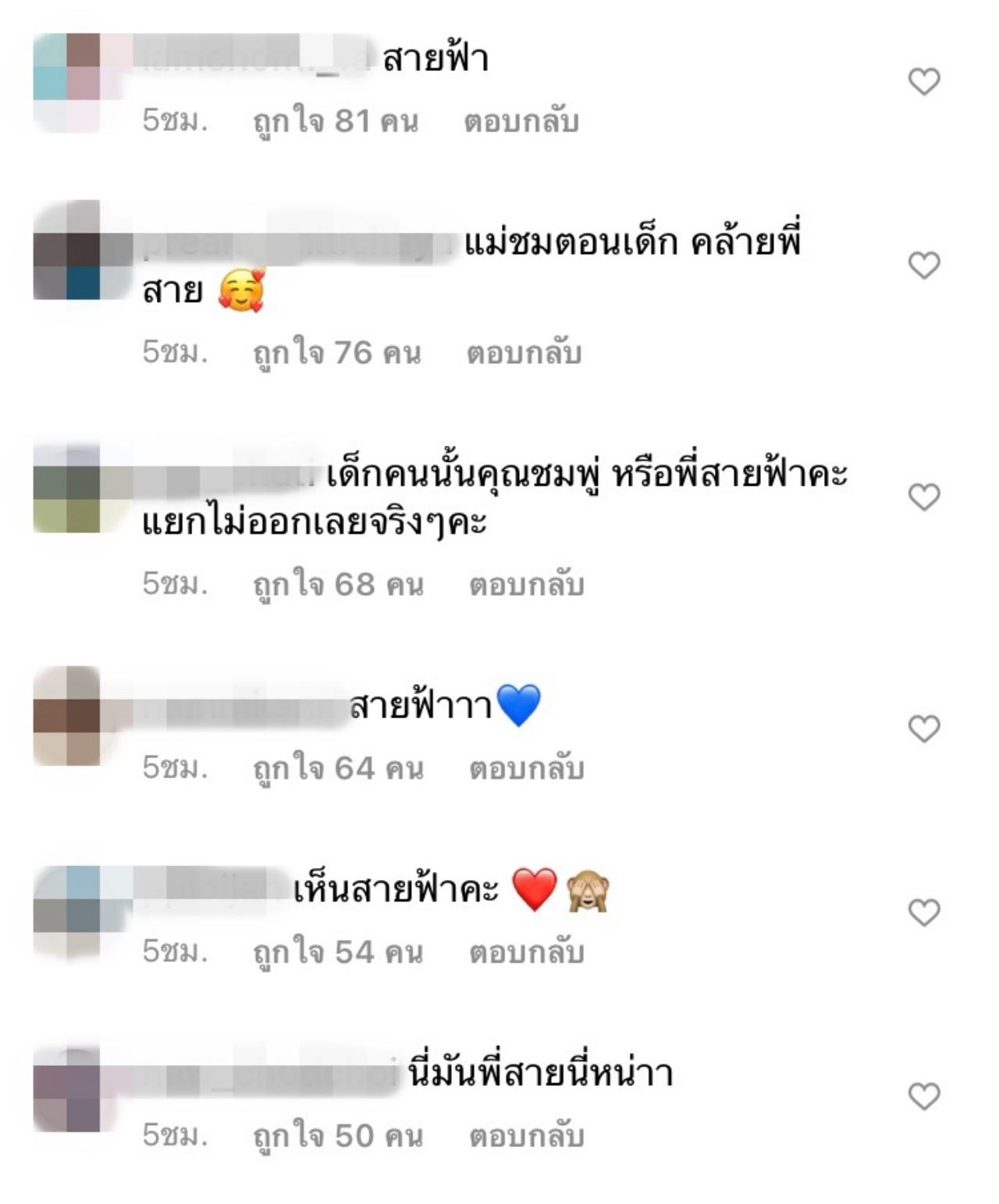 งานนี้ทำเอาทั้งเพื่อนๆ ในวงการบันเทิงและแฟนๆ ที่ติดตามต่างเข้ามาคอมเมนต์กันเป็นจำนวนมาก ซึ่งทุกคนต่างก็บอกเป็นเสียงเดียวกันว่า เห็นพี่สายฟ้า เพราะหน้าเหมือนกันมาก และบางคนยังบอกอีกว่า ลูกหน้าเหมือนแม่ หรือแม่หน้าเหมือนลูกกันนะ