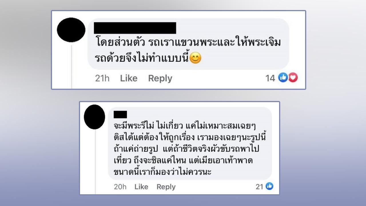 “จะมีพระรึไม่ ไม่เกี่ยว แค่ไม่เหมาะสมเฉยๆ ติสได้แต่ต้องให้ถูกเรื่อง เรามองเฉยๆ นะรูปนี้ ถ้าแค่ถ่ายรูป แต่ถ้าชีวิตจริงผัวขับรถพาไปเที่ยว ถึงจะชิลแค่ไหน แต่เมียเอาเท้าพาดขนาดนี้เราก็มองว่าไม่ควรนะ” และ “โดยส่วนตัว รถเราแขวนพระและให้พระเจิมรถด้วย จึงไม่ทำแบบนี้”.
