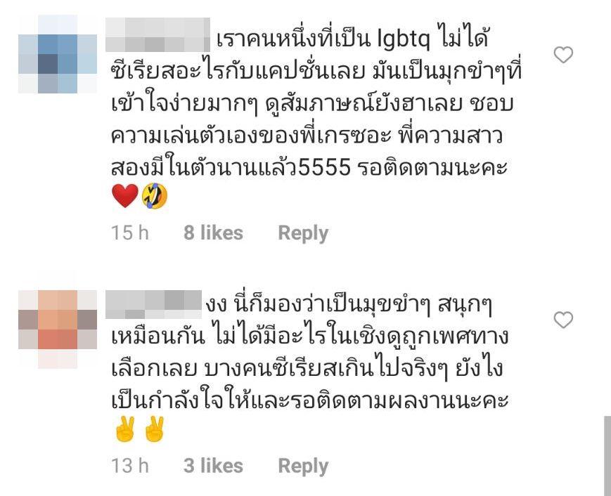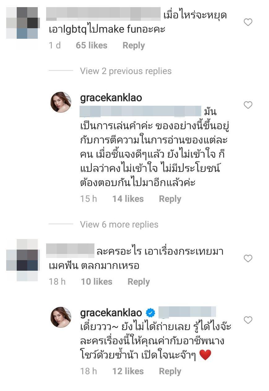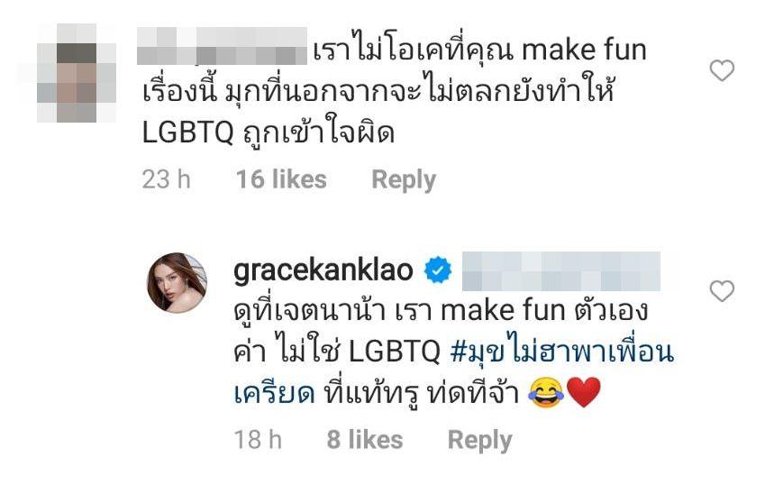 แต่ดราม่าเกิดเมื่อมีชาวเน็ตบางคนเข้ามาคอมเมนต์ดราม่าหาว่าเจ้าตัวล้อเลียน LGBTQ และอาจทำให้เกิดความเข้าใจผิด อาทิ ละครอะไร เอาเรื่องกะเทยมาเมคฟัน ตลกมากเหรอ, เมื่อไหร่จะหยุดเอา LGBTQ ไป make fun, เราไม่โอเคที่คุณ make fun เรื่องนี้ มุกที่นอกจากจะไม่ตลกยังทำให้ LGBTQ ถูกเข้าใจผิด แต่ก็มีบางคนที่บอกว่าตนก็เป็น LGBTQ เหมือนกัน แต่ไม่ได้ซีเรียสกับแคปชั่น เพราะเป็นมุกขำๆ ที่เข้าใจง่ายมากๆ ชอบความเล่นตัวเองของเกรซ บ้างก็บอกว่าเข้าใจการเล่นคำ ฯลฯ