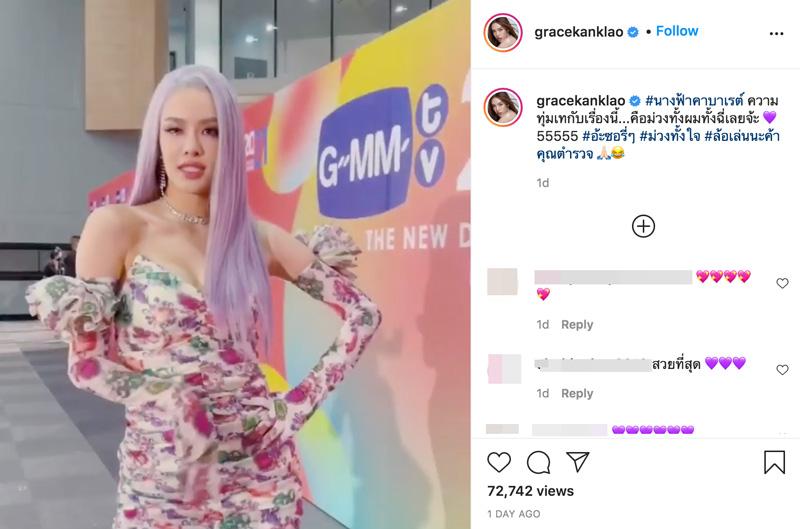 โดย เกรซ กาญจน์เกล้า โพสต์คลิปตัวเองกับลุคแซ่บๆ ผมสีม่วง พร้อมทั้งเขียนแคปชั่นบรรยายว่า “#นางฟ้าคาบาเรต์ ความทุ่มเทกับเรื่องนี้...คือ ม่วงทั้งผมทั้งฉี่เลยจ้ะ 555 #อ่ะซอรี่ๆ #ม่วงทั้งใจ #ล้อเล่นนะค้าคุณตำรวจ”