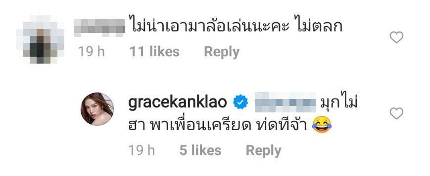 ซึ่งหลังจากเกิดดราม่า เกรซจึงเปลี่ยนแคปชั่นเพื่อเบรกดราม่าที่เกิดขึ้นว่า “#นางฟ้าคาบาเรต์ ความทุ่มเทกับเรื่องนี้...คือ ผมม่วงอย่างเดียวดีกว่าจ้า 55555 #ไม่ดราม่าน้า เรื่องนี้เป็นเรื่องของผู้หญิงคนหนึ่งที่ต้องปลอมตัวเป็นนางโชว์สาวสองแทนพี่ชายที่หายตัวไป น้องจะทำให้เต็มที่ ถ่ายทอดออกมาให้ได้อย่างดีที่สุดเลยจ้าาา!!” พร้อมทั้งตอบชาวเน็ตที่ดราม่าว่า “มุกไม่ฮาพาเพื่อนเครียด โทษทีจ้า”.