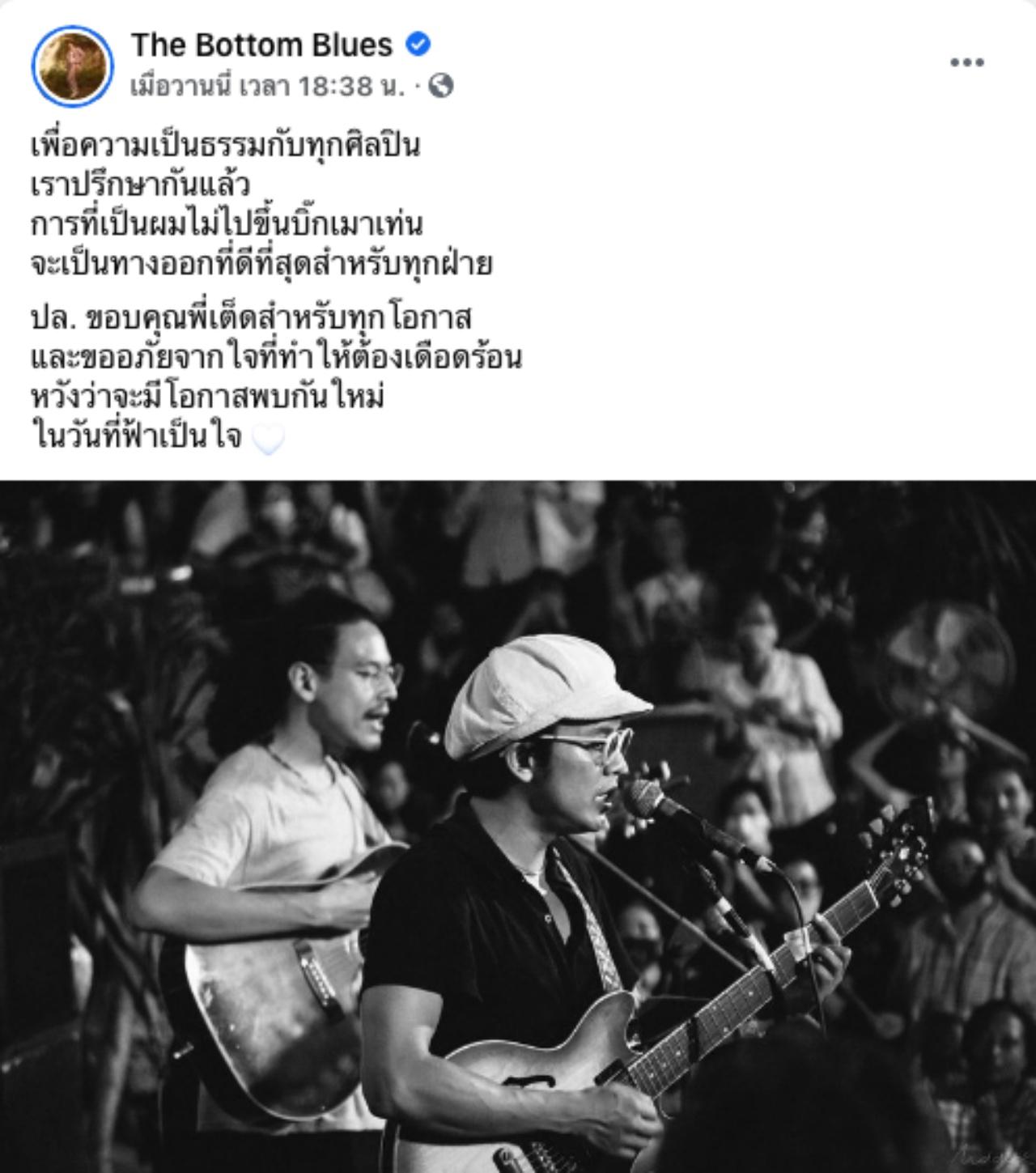 "เพื่อความเป็นธรรมกับทุกศิลปิน เราปรึกษากันแล้ว การที่เป็นผมไม่ไปขึ้นบิ๊กเมาน์เท่น จะเป็นทางออกที่ดีที่สุดสำหรับทุกฝ่าย ป.ล. ขอบคุณพี่เต็ดสำหรับทุกโอกาสและขออภัยจากใจที่ทำให้ต้องเดือดร้อน หวังว่าจะมีโอกาสพบกันใหม่ ในวันที่ฟ้าเป็นใจ"