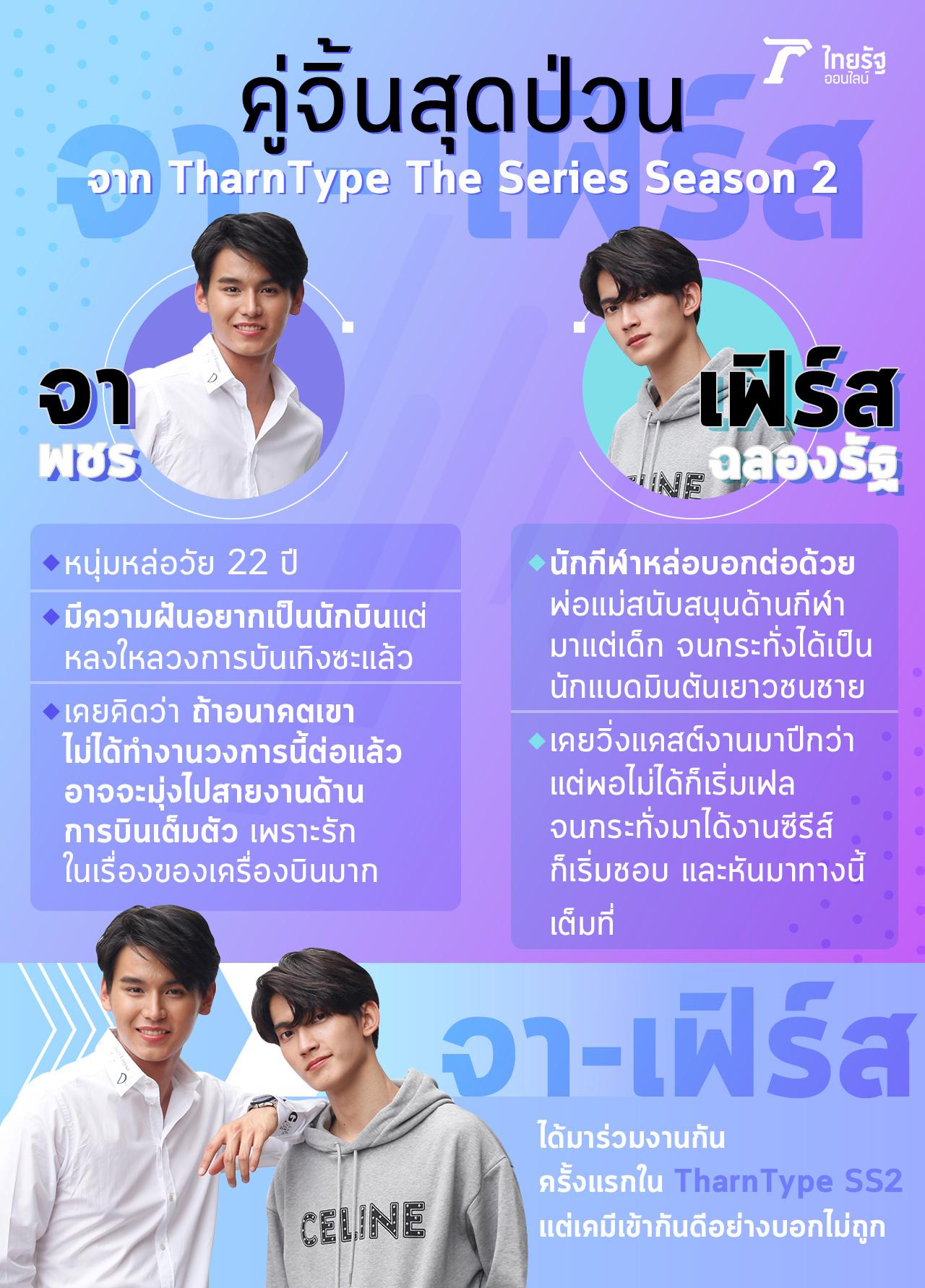 เป็นอีกหนึ่งคู่ที่กำลังได้รับความสนใจจากแฟนซีรีส์ TharnType The Series ซีซั่น 2 อย่างมาก สำหรับ จา พชร สวนศรี และ เฟิร์ส ฉลองรัฐ นอบสำโรง 2 หนุ่มที่จะเข้ามาสร้างความอาถรรพ์ให้กับรัก 7 ปีของ ธารและไทป์ ที่แสดงโดย มิว ศุภศิษฏ์ จงชีวีวัฒน์ กับ กลัฟ คณาวุฒิ ไตรพิพัฒนพงษ์ ใน TharnType SS2 โดยในวันนี้ บันเทิงไทยรัฐออนไลน์ จะพาแฟนๆ ซีรีส์มาทำความรู้จัก 2 หนุ่ม จา-เฟิร์ส ให้มากขึ้น