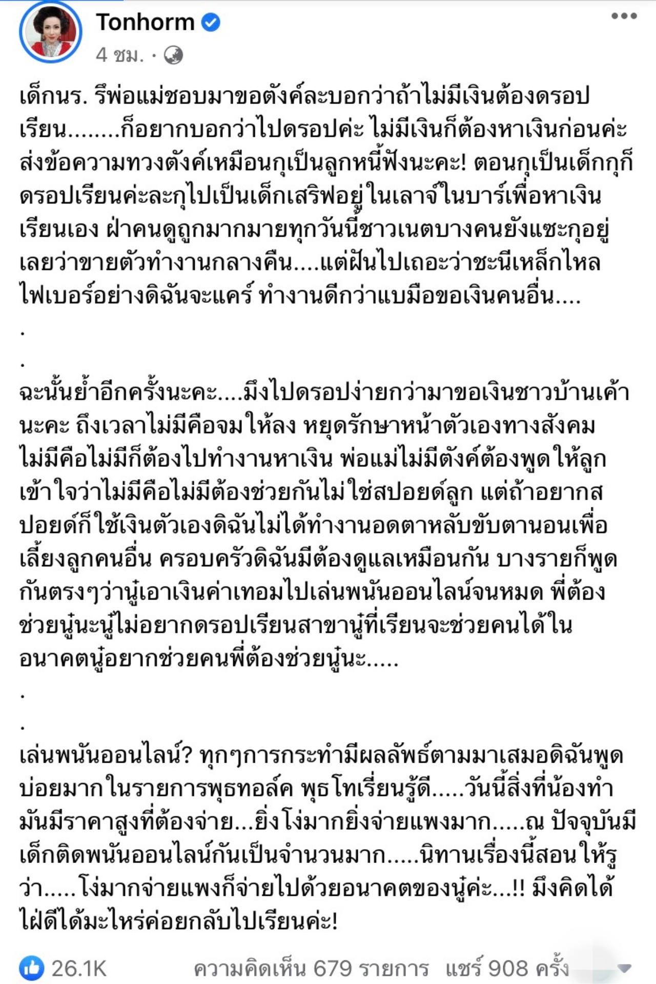“เด็ก นร. รึพ่อแม่ชอบมาขอตังค์ละบอกว่าถ้าไม่มีเงินต้องดรอปเรียน........ก็อยากบอกว่าไปดรอปค่ะ ไม่มีเงินก็ต้องหาเงินก่อนค่ะ ส่งข้อความทวงตังค์เหมือนกุเป็นลูกหนี้ฟังนะคะ! ตอนกุเป็นเด็กกุก็ดรอปเรียนค่ะ