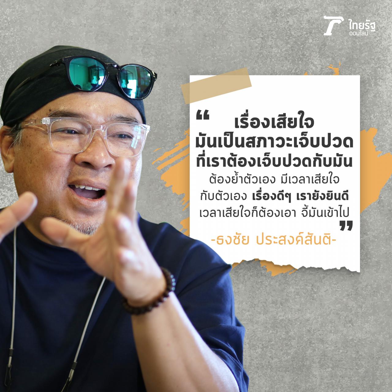 ยิ่งตอนที่พี่ตั้ว ศรัณยู เสียชีวิต ทำให้เรารู้สึกและมานั่งถามว่า ตัวตนจริงๆ ของธงชัยมีอยู่มั้ย ในชีวิตเรามีแต่การแสดง บางทีอยากพักบ้าง อยากเกษียณ (หัวเราะ) อยากหยุดนั่งมอง พวกเราทำงานหนักโดยที่ไม่รู้ตัว บ้างาน