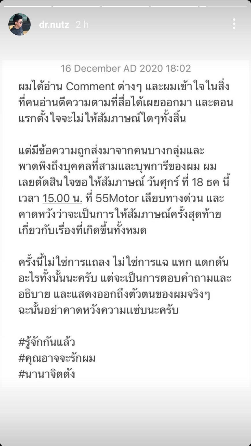 ล่าสุด ดร.นัท โพสต์ภาพข้อความลงไอจีสตอรี่อีกครั้ง โดยบอกว่า “ผมได้อ่าน Comment ต่างๆ และผมเข้าใจในสิ่งที่คนอ่านตีความตามที่สื่อได้เผยออกมา และตอนแรกตั้งใจจะไม่ให้สัมภาษณ์ใดๆ ทั้งสิ้น