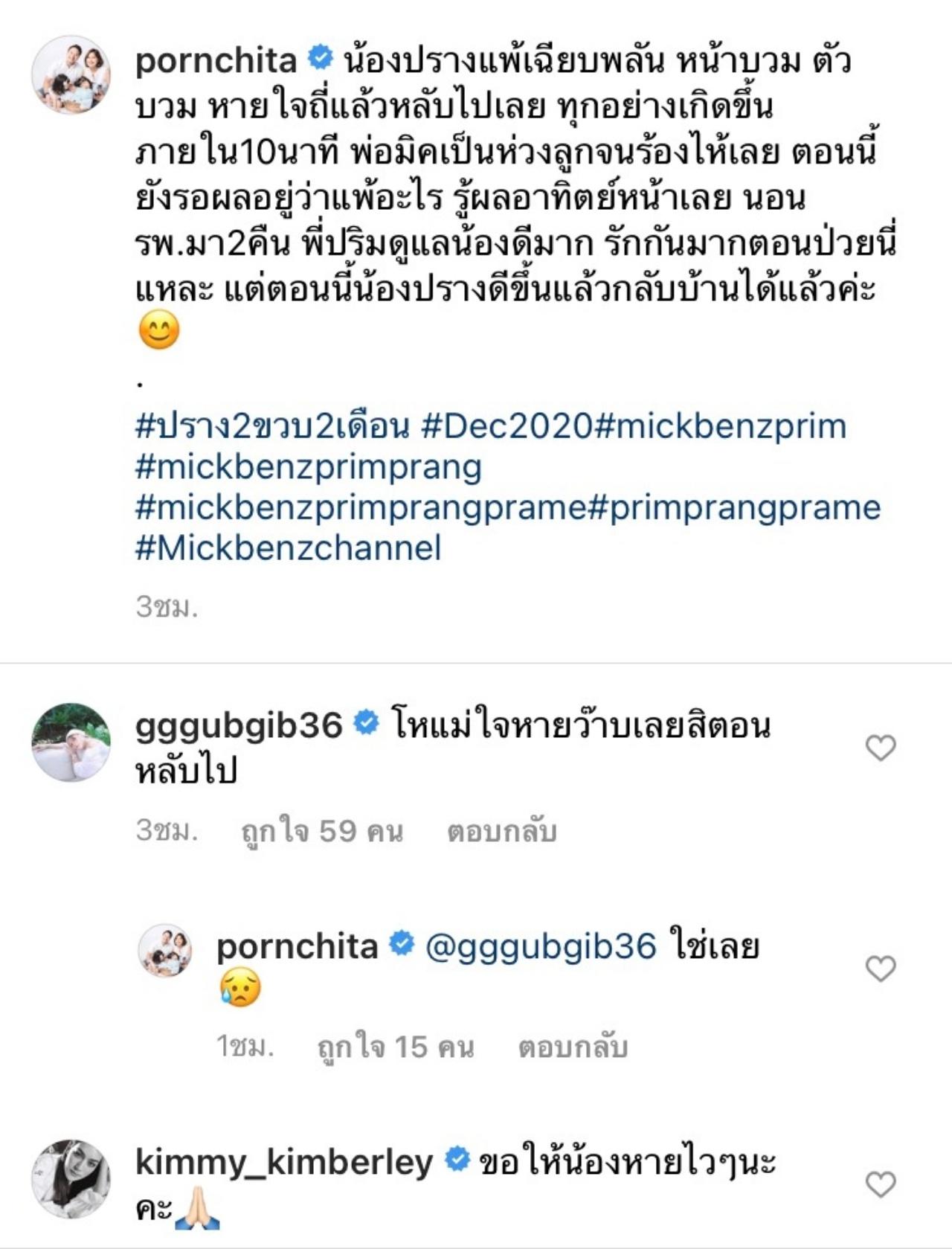 โดย แม่เบนซ์ ได้โพสต์ภาพพร้อมกับเขียนว่า "น้องปรางแพ้เฉียบพลัน หน้าบวม ตัวบวม หายใจถี่แล้วหลับไปเลย ทุกอย่างเกิดขึ้นภายใน 10 นาที พ่อมิคเป็นห่วงลูกจนร้องไห้เลย ตอนนี้ยังรอผลอยู่ว่าแพ้อะไร รู้ผลอาทิตย์หน้าเลย นอน รพ.มา 2 คืน พี่ปริมดูแลน้องดีมาก รักกันมากตอนป่วยนี่แหละ แต่ตอนนี้น้องปรางดีขึ้นแล้ว กลับบ้านได้แล้วค่ะ"