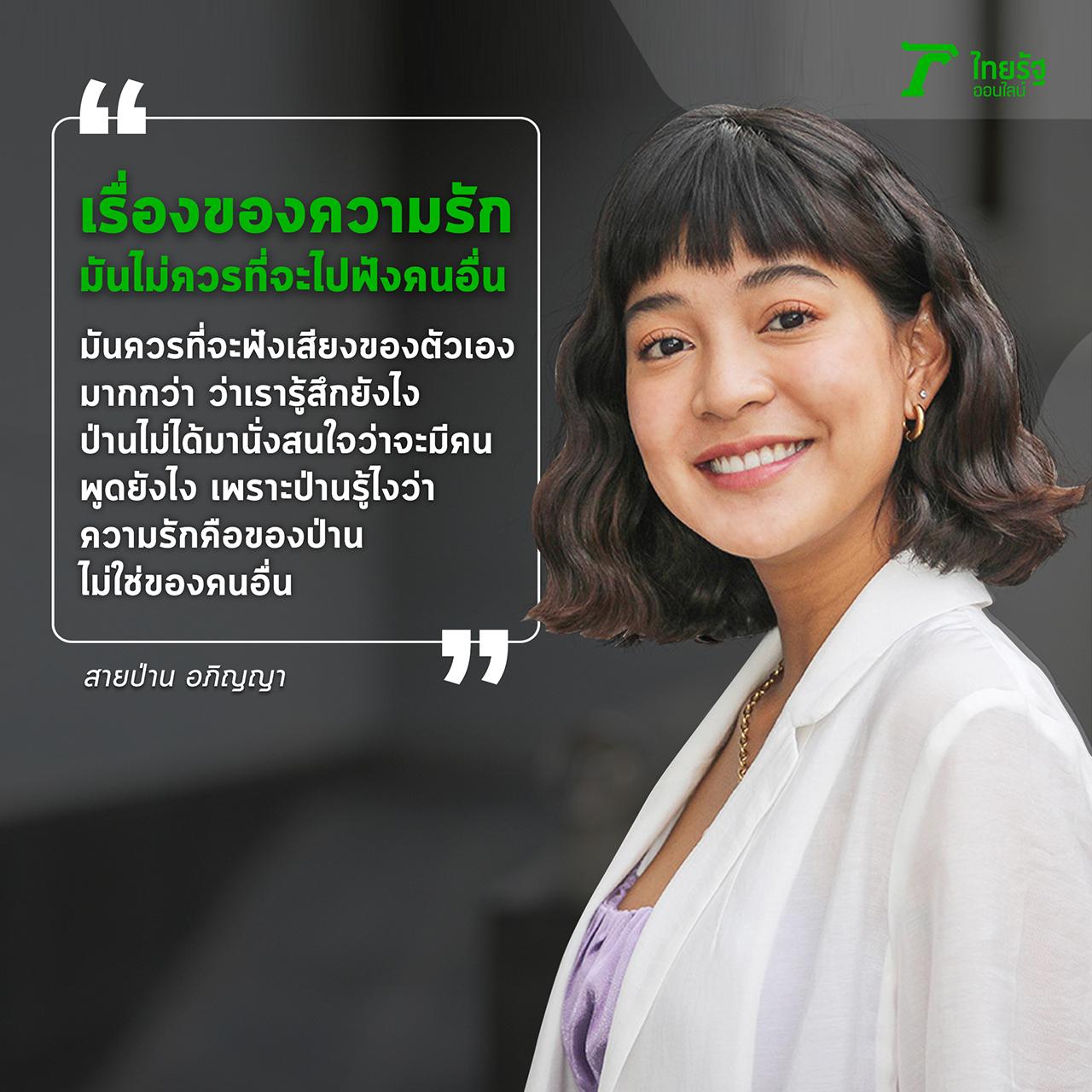 และเรื่องของความรักมันไม่ควรที่จะไปฟังคนอื่น มันควรที่จะฟังเสียงของตัวเองมากกว่าว่าเรารู้สึกยังไง ป่านก็เลยไม่ได้มานั่งสนใจว่าจะมีคนพูดยังไง เพราะป่านรู้ไงว่าความรักคือของป่าน ไม่ใช่ของคนอื่น