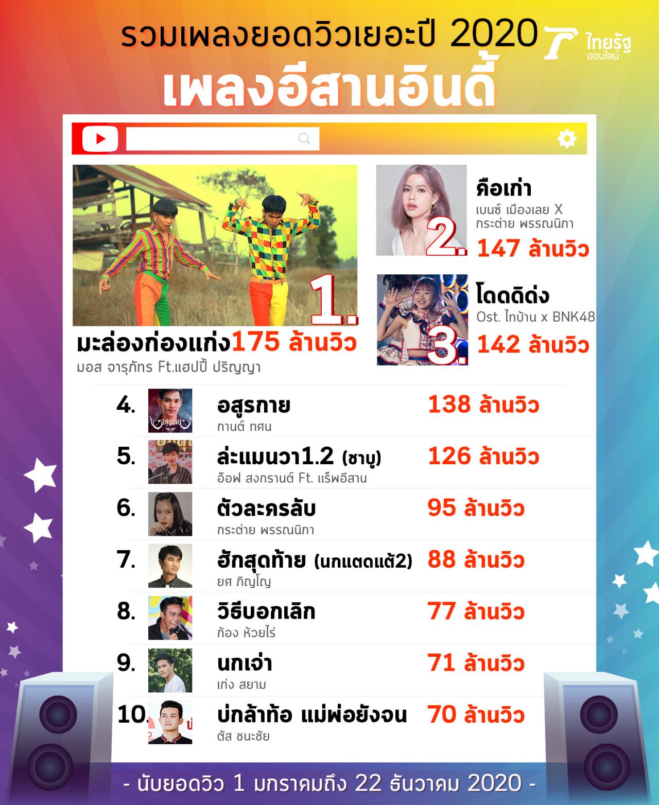 8. 77,254,392 วิธีบอกเลิก - ก้อง ห้วยไร่ เริ่มปล่อยทางยูทูบ 22 มี.ค. 2020 (คลิกฟัง) เจ้าพ่อเพลงอีสานอินดี้ ยังท็อปฟอร์มอยู่ ยังมีฮิตเพลง พิสูจน์ว่าสำเร็จที่ผ่านมาไม่ใช่เรื่องฟลุกๆ ร้องเองเล่นเองใน MV ตีบทแตกกระจุย
