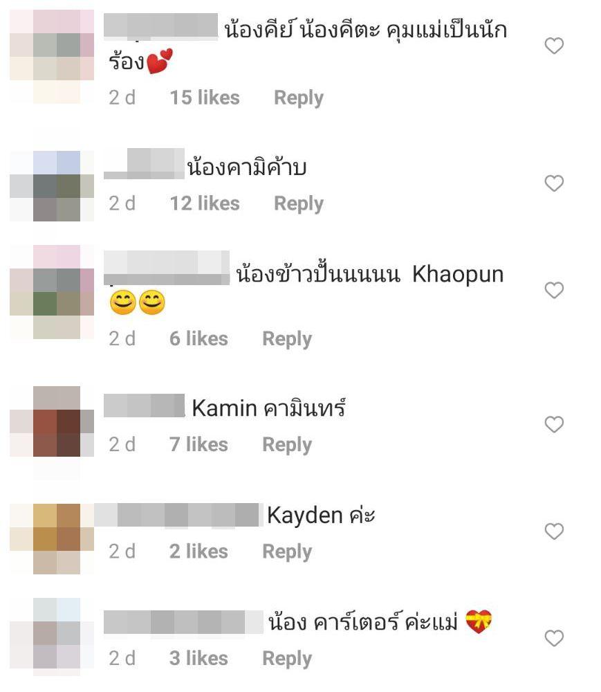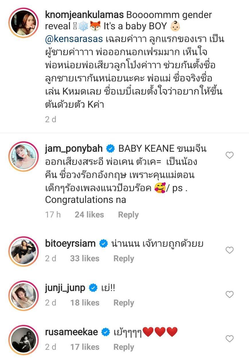 โดยมีเพื่อนๆ ในวงการบันเทิง รวมถึงแฟนๆ คอมเมนต์แสดงความยินดี พร้อมทั้งตั้งชื่อให้ลูกชายตัวน้อยในท้องหลายชื่อ อาทิ น้องคีน, น้องคีย์, น้องคีตะ, น้องคามิ, น้องข้าวปั้น, น้องคาร์เตอร์ ฯลฯ แต่งานนี้ชื่อไหนถูกใจว่าที่คุณพ่อคุณแม่คงต้องรอดูจ้า.