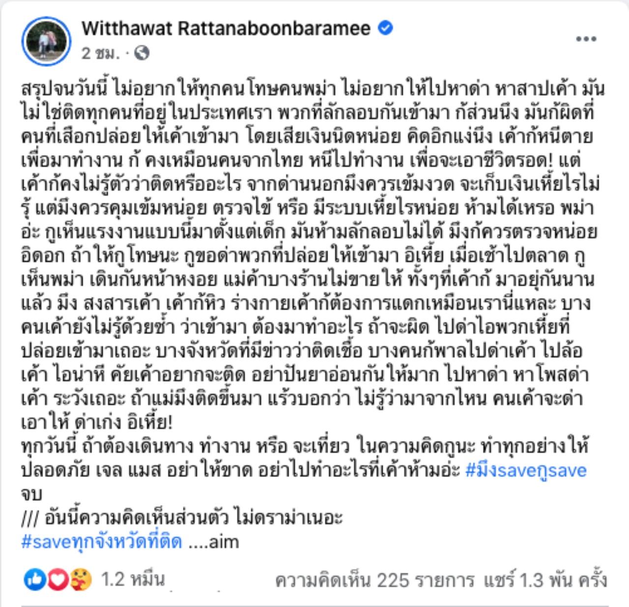 "สรุปจนวันนี้ ไม่อยากให้ทุกคนโทษคนพม่า ไม่อยากให้ไปหาด่า หาสาปเค้า มันไม่ใช่ติดทุกคนที่อยู่ในประเทศเรา พวกที่ลักลอบกันเข้ามา ก็ส่วนนึง มันก็ผิดที่คนที่เ_ือกปล่อยให้เค้าเข้ามา โดยเสียเงินนิดหน่อย คิดอีกแง่นึง เค้าก็หนีตายเพื่อมาทำงาน ก็ คงเหมือนคนจากไทย หนีไปทำงาน เพื่อจะเอาชีวิตรอด!