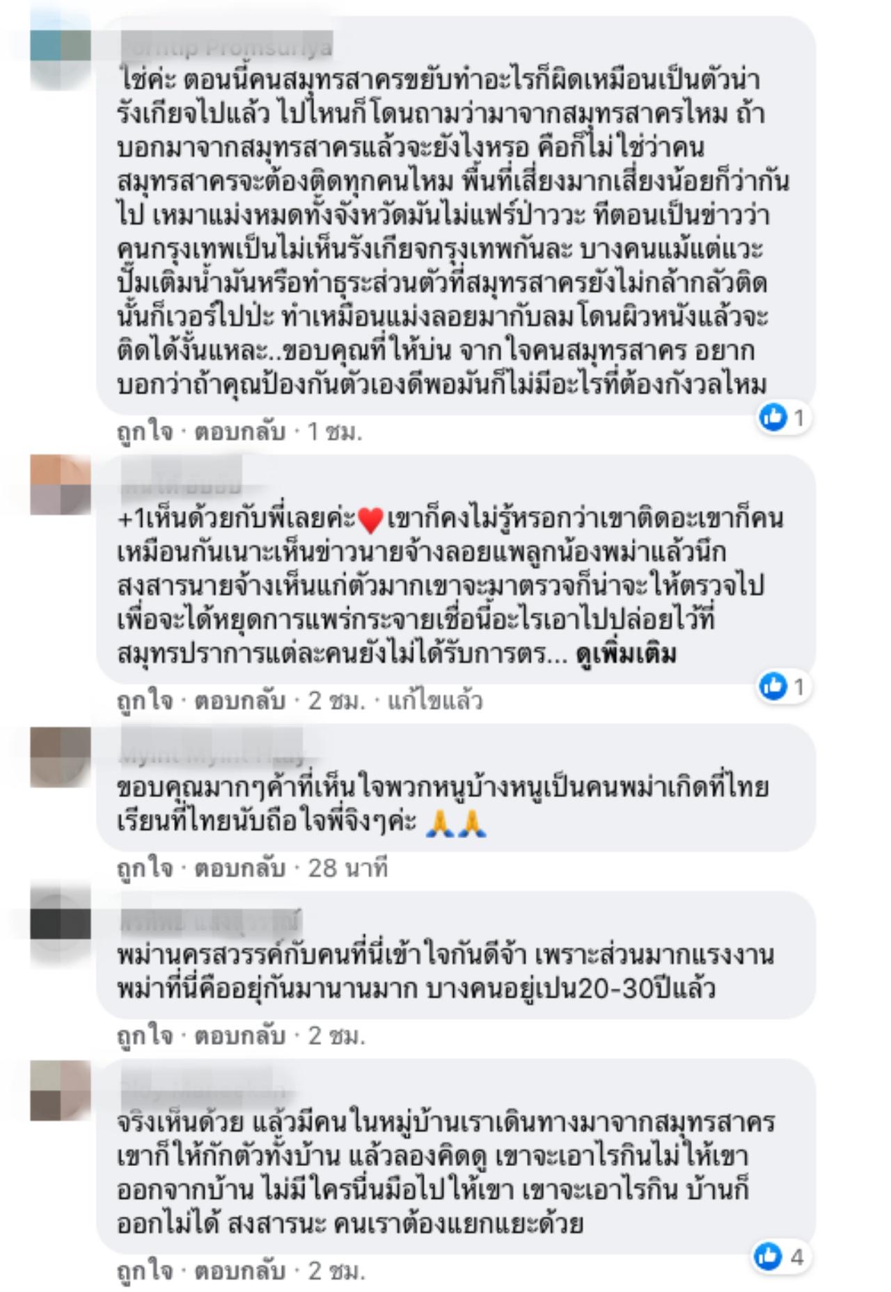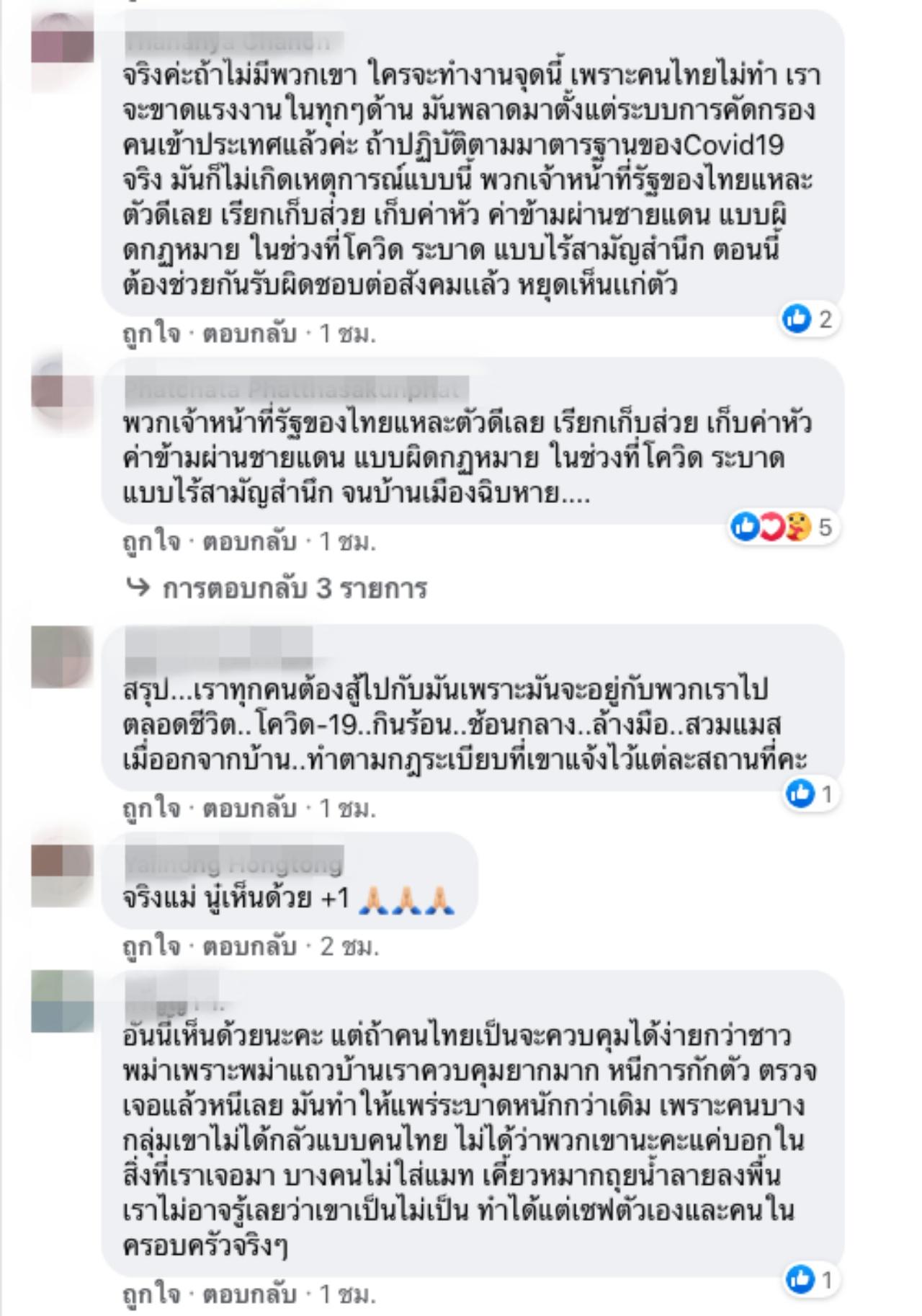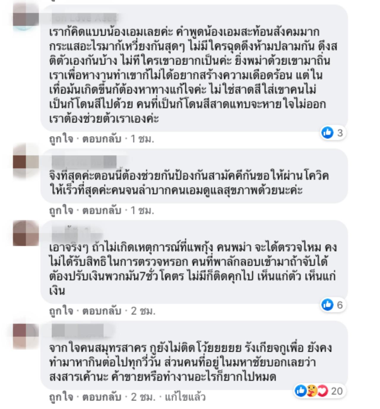 หลังจากที่ เอม ได้โพสต์ ก็มีคนเข้ามาแสดงความคิดเห็นเป็นจำนวนมาก และเห็นด้วยกับสิ่งที่ เอม โพสต์ โดยบางคนบอกว่า ตนเองเป็นชาวเมียนมาที่เข้ามาทำงานในไทยได้ 15 ปีแล้ว ขอบคุณที่เห็นใจพวกหนู, ต้องโทษคนคุมด่านของเราที่ปล่อยให้เข้ามา ไม่มีการเข้มงวดใดๆ
