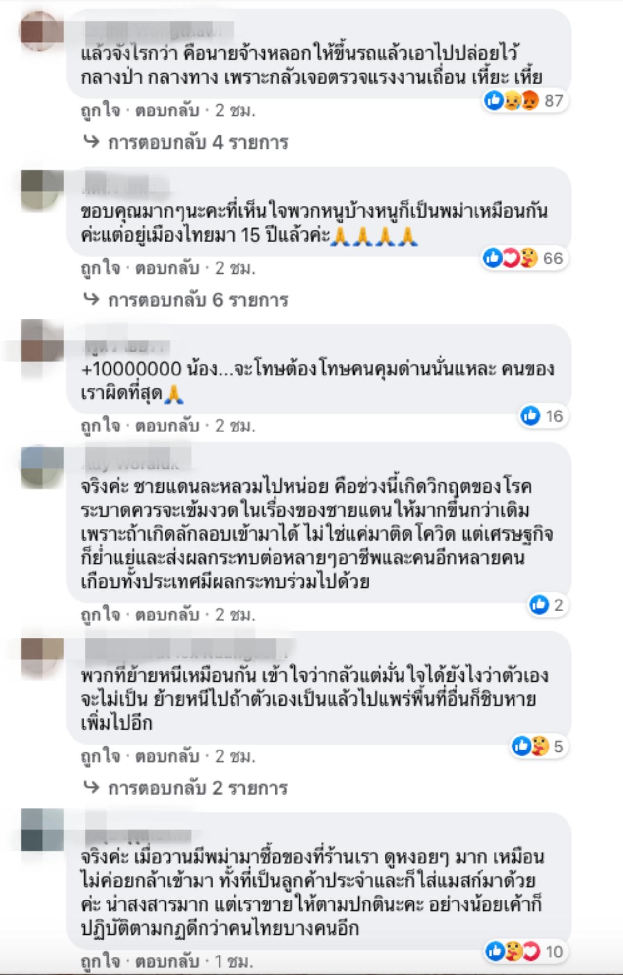 และได้มีคนเข้ามาเล่าให้ฟังว่า มีชาวเมียนมาเข้ามาซื้อของในร้าน เค้าดูหงอยมาก ไม่กล้าเข้ามาซื้อ "จริงค่ะ เมื่อวานมีพม่ามาซื้อของที่ร้านเรา ดูหงอยๆ มาก เหมือนไม่ค่อยกล้าเข้ามา ทั้งที่เป็นลูกค้าประจำและก็ใส่แมสก์มาด้วยค่ะ น่าสงสารมาก แต่เราขายให้ตามปกตินะคะ อย่างน้อยเค้าก็ปฏิบัติตามกฎดีกว่าคนไทยบางคนอีก".