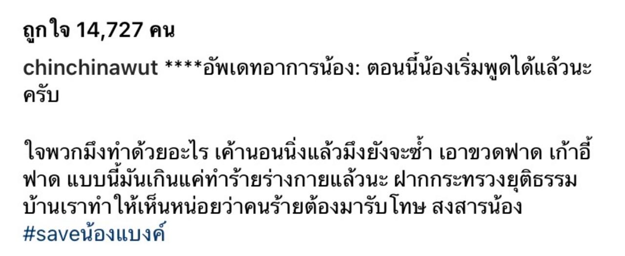 ล่าสุด ชิน ชินวุฒ โพสต์อินสตาแกรมของตัวเอง เป็นข่าวของน้องแบงค์พร้อมกับอัปเดตอาการว่า “อัพเดทอาการน้อง: ตอนนี้น้องเริ่มพูดได้แล้วนะครับ ใจพวกมึงทำด้วยอะไร เค้านอนนิ่งแล้วมึงยังจะซ้ำ เอาขวดฟาด เก้าอี้ฟาด แบบนี้มันเกินแค่ทำร้ายร่างกายแล้วนะ ฝากกระทรวงยุติธรรมบ้านเราทำให้เห็นหน่อยว่าคนร้ายต้องมารับโทษ สงสารน้อง #saveน้องแบงค์”