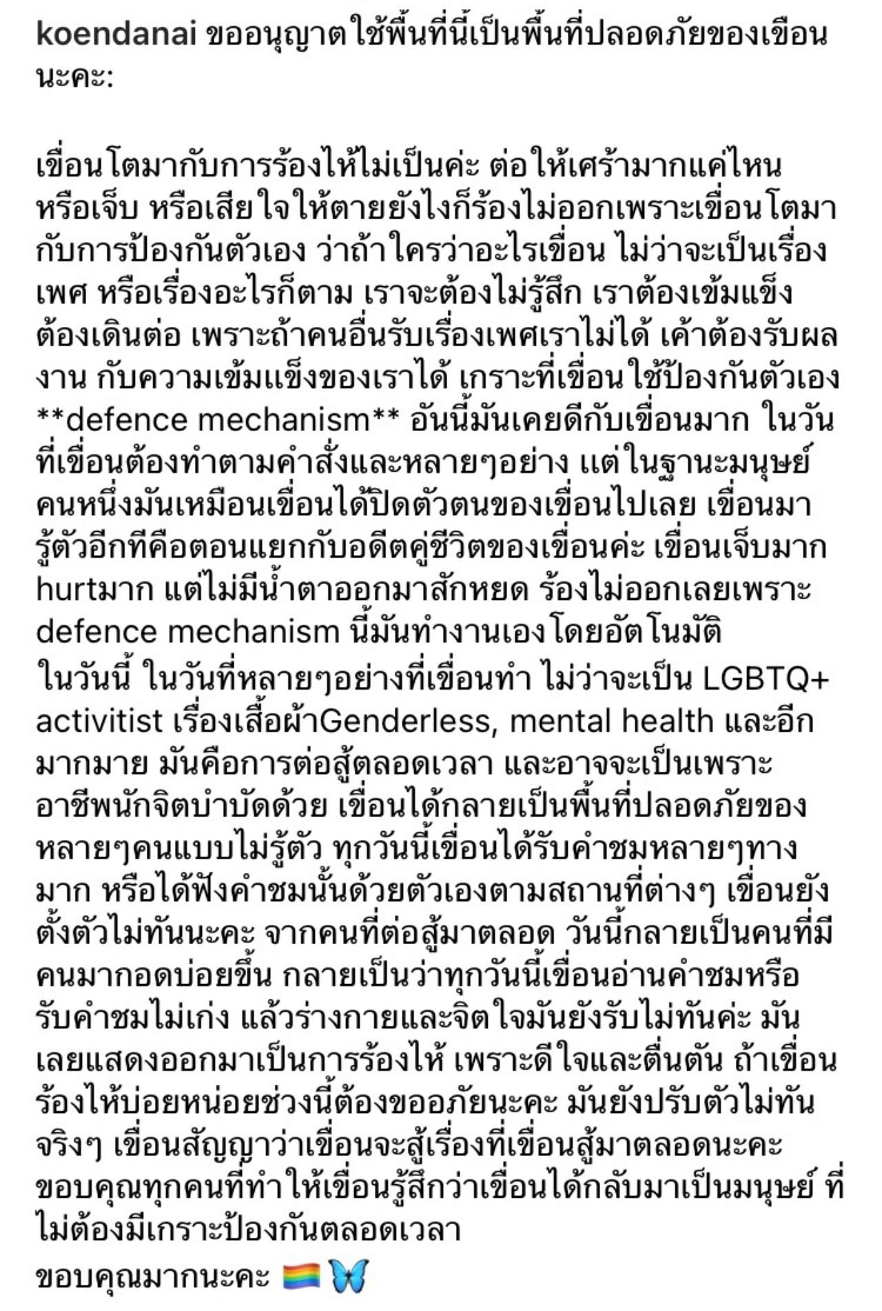 ถ้าเขื่อนร้องไห้บ่อยหน่อยช่วงนี้ต้องขออภัยนะคะ มันยังปรับตัวไม่ทันจริงๆ เขื่อนสัญญาว่าเขื่อนจะสู้เรื่องที่เขื่อนสู้มาตลอดนะคะ ขอบคุณทุกคนที่ทำให้เขื่อนรู้สึกว่าเขื่อนได้กลับมาเป็นมนุษย์ ที่ไม่ต้องมีเกราะป้องกันตลอดเวลา ขอบคุณมากนะคะ"