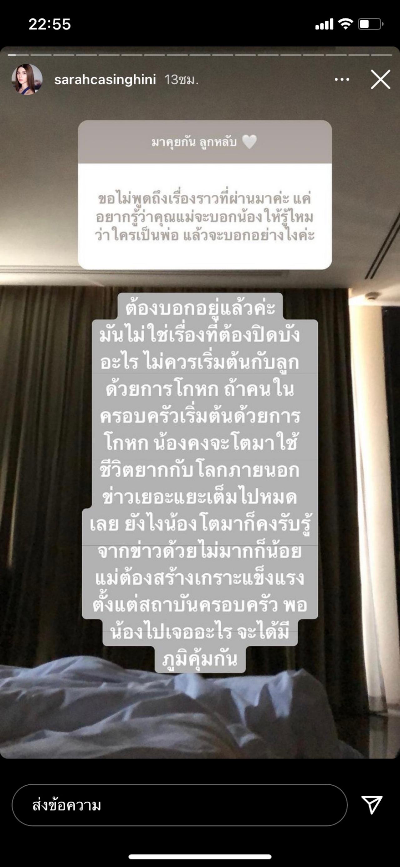“ขอไม่พูดถึงเรื่องราวที่ผ่านมาค่ะ แค่อยากรู้ว่าคุณแม่จะบอกน้องให้รู้ไหมว่าใครเป็นพ่อ แล้วจะบอกอย่างไรคะ” ซึ่ง ซาร่า คาซิงกินี ได้ตอบคำถามนี้ว่า “ต้องบอกอยู่แล้วค่ะ มันไม่ใช่เรื่องที่ต้องปิดบังอะไร ไม่ควรเริ่มต้นกับลูกด้วยการโกหก ถ้าคนในครอบครัวเริ่มต้นด้วยการโกหก