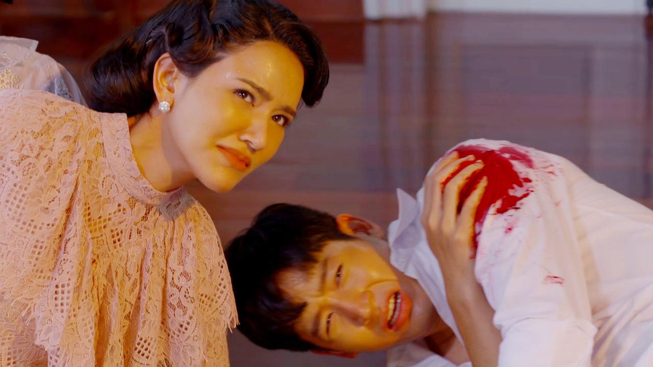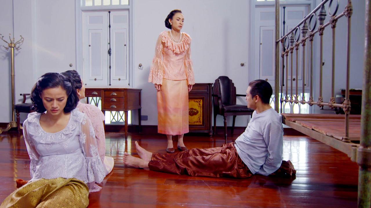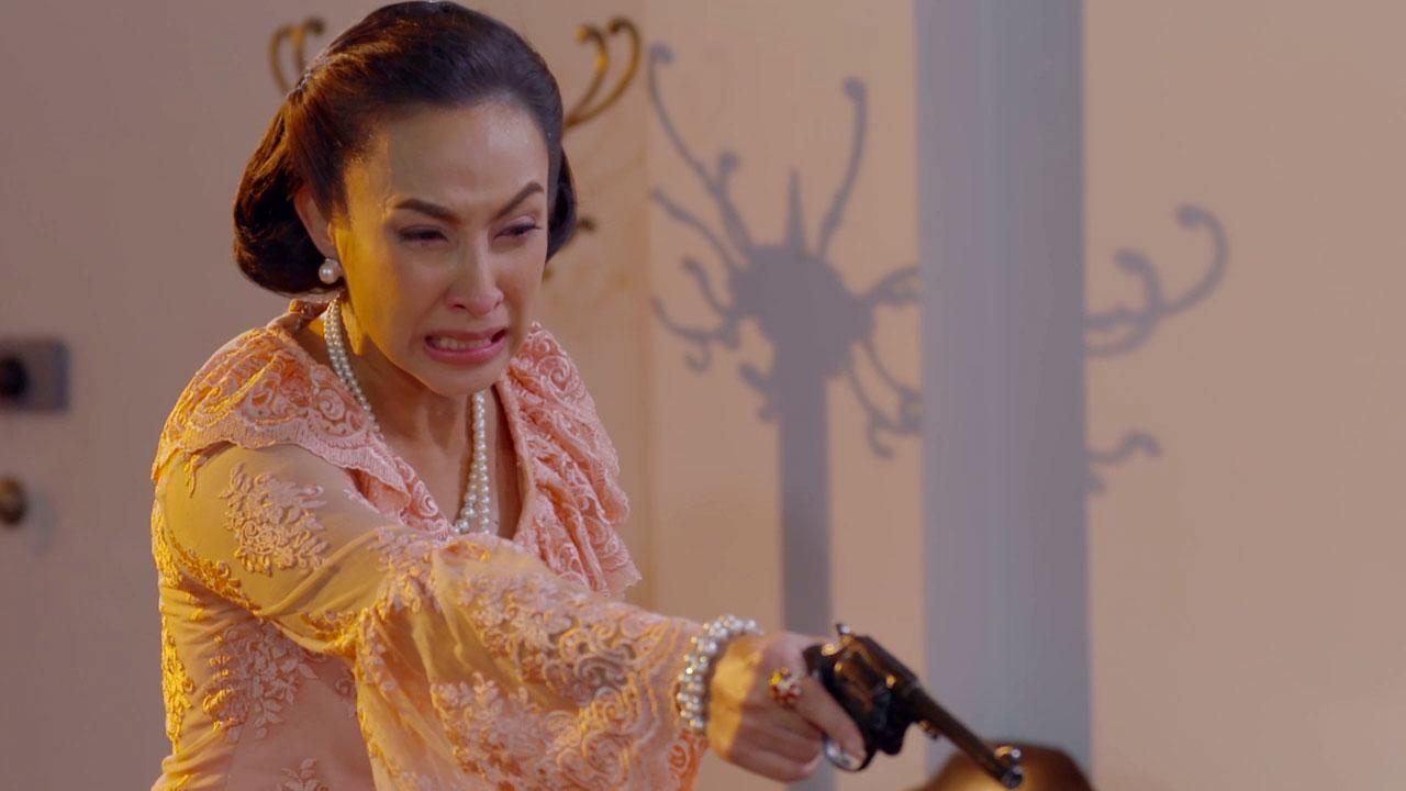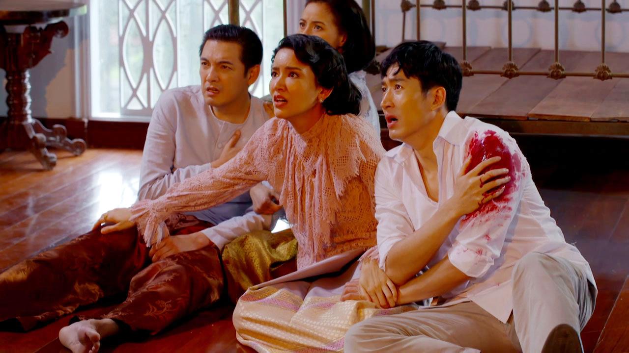เป็นฉากที่ ศรีประไพ (แคทรียา อิงลิช) แสร้งกินยาฆ่าตัวตายหวังให้ทุกคนตายใจ แต่กลับซ้อนแผนตบตาเล่นละครเพื่อที่จะวางยาสลบคนทั้งบ้านและจับ กิ่งจันทร์ (ไอซ์-อมีนา) อิศเรศ (หนุ่ม-ศรราม) รตี (น้ำฝน-กุลณัฐ) มัดไว้ และเผาบ้านหลังนี้เพื่อเป็นการแก้แค้นอิศเรศและครอบครัว อิศเรศพยายามอธิบายว่าศรีประไพเข้าใจผิดมาโดยตลอด แต่ศรีประไพไม่ฟัง ยกปืนมาทำท่าจะยิงทุกคน เริ่มจากกิ่งจันทร์ เกล้า (ไนกี้-นิธิดล) ที่บุกมา ช่วยรับกระสุนแทนกิ่งจันทร์ไว้ได้ทัน