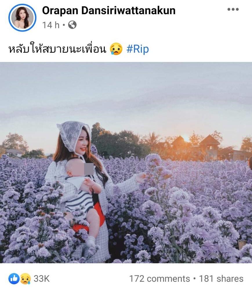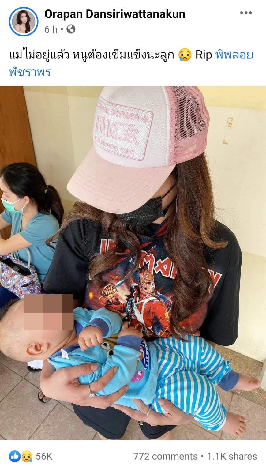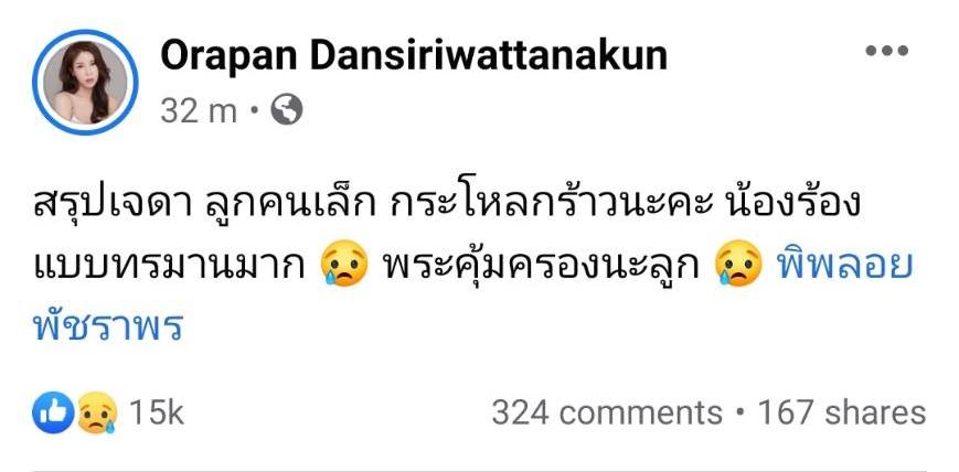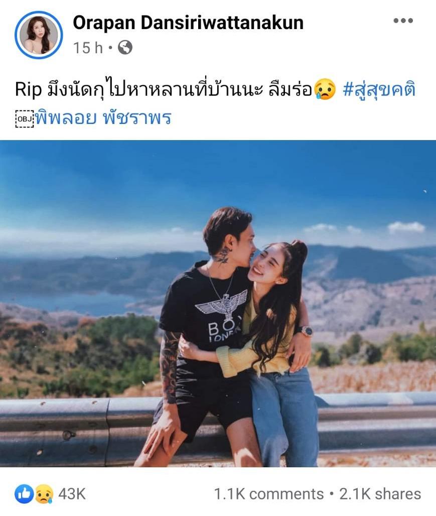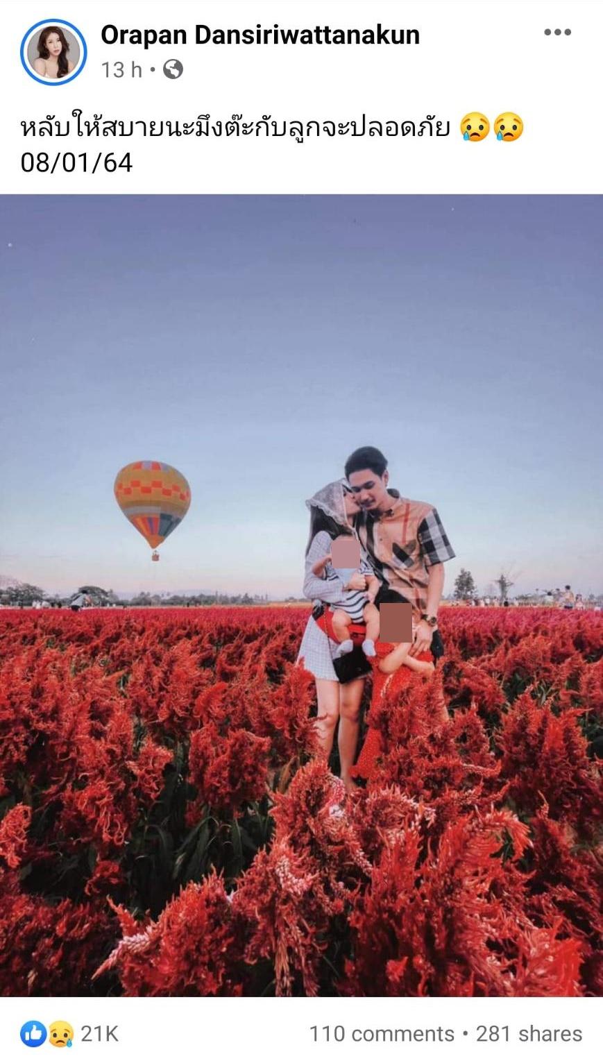 ก่อนจะโพสต์ภาพครอบครัวพิพลอยและเขียนข้อความ “หลับให้สบายนะมึง ต๊ะกับลูกจะปลอดภัย 08/01/64” อีกทั้งยังโพสต์ภาพอุ้มลูกคนเล็กของพิพลอยและเขียนข้อความว่า “แม่ไม่อยู่แล้ว หนูต้องเข็มแข็งนะลูก Rip พิพลอย พัชราพร”