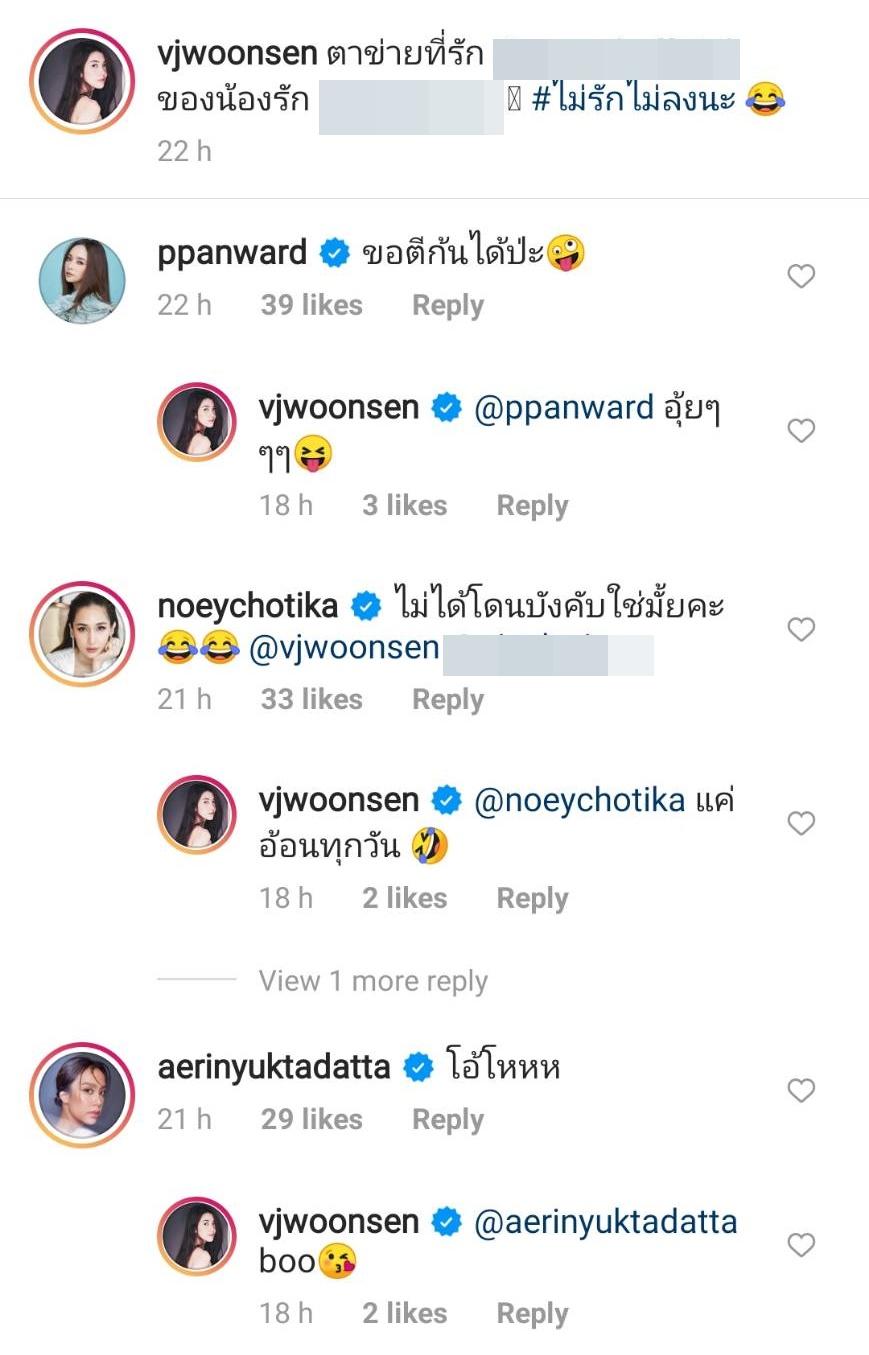 งานนี้นอกจากจะมีคอมเมนต์แซวความแซ่บของวุ้นเส้นจากแฟนๆ แล้ว บรรดาคนบันเทิงก็ไม่พลาดคอมเมนต์แซวเช่นกัน อาทิ เป้ย ปานวาด “ขอตีก้นได้ป่ะ”, แอริน ยุกตะทัต “โอ้โหหห”, เนย โชติกา “ไม่ได้โดนบังคับใช่มั้ยคะ” ฯลฯ