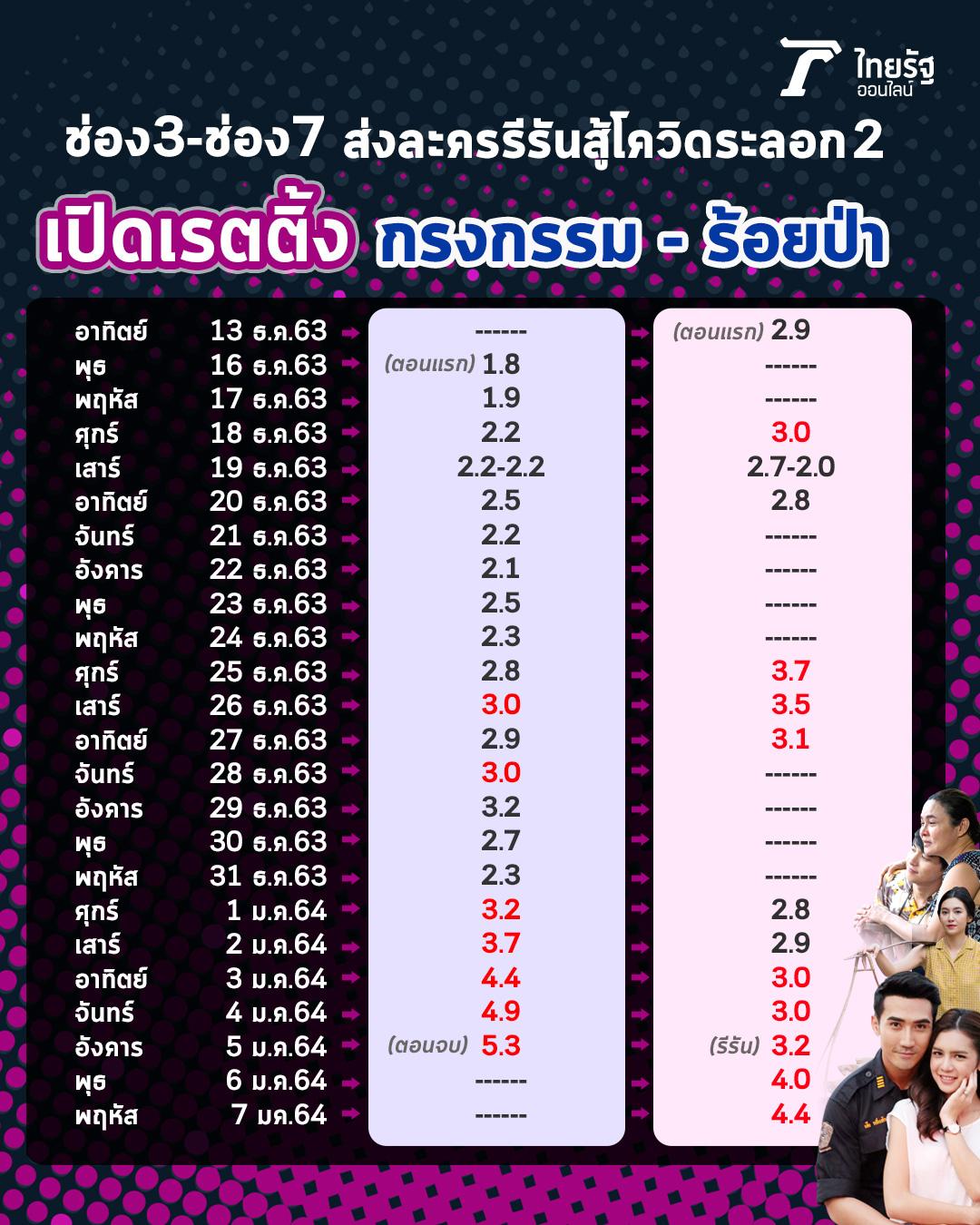 พฤหัส 17 ธ.ค.63 กรงกรรมเรตติ้งขึ้นมาเป็น 1.9 ศุกร์ 18 ธ.ค.63 กรงกรรมไต่มาเป็น 2.2 และ ร้อยป่านำอยู่ที่ 3.0