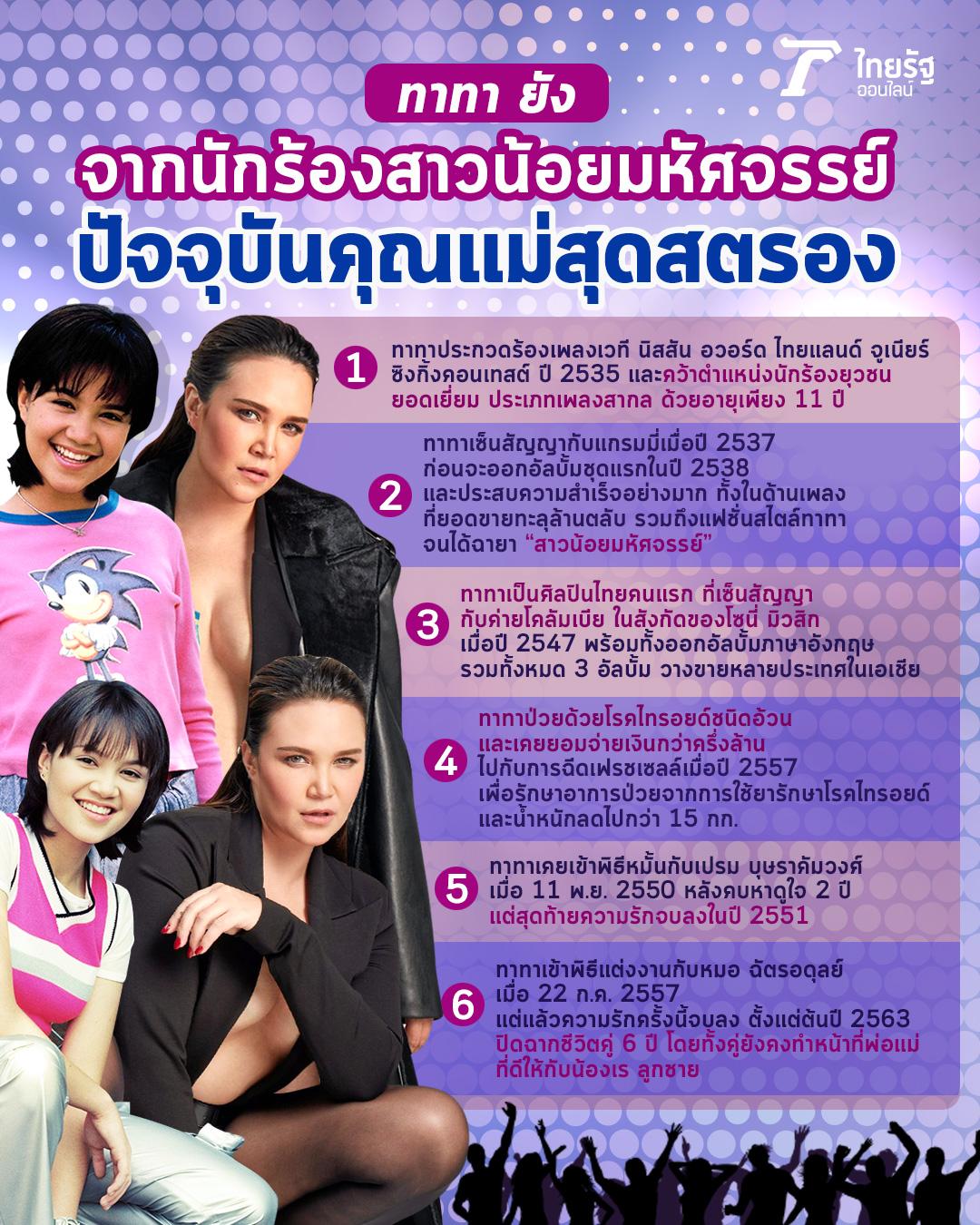 จนกระทั่ง 23 ธ.ค. 2563 ทาทาก็ได้ออกมายอมรับว่าเลิกรากับหมอแล้วจริงๆ แต่ไม่ได้ลงรายละเอียดถึงสาเหตุที่เลิกรา ปิดฉากชีวิตคู่ยาวนาน 6 ปี แม้จะไม่ใช่ผู้หญิงที่ลักกี้อินเลิฟ แต่ทาทาก็ยังคงเป็นสาวมั่นและคุณแม่สุดสตรองของลูกชายสุดรักอย่างน้องเรอยู่เสมอ.