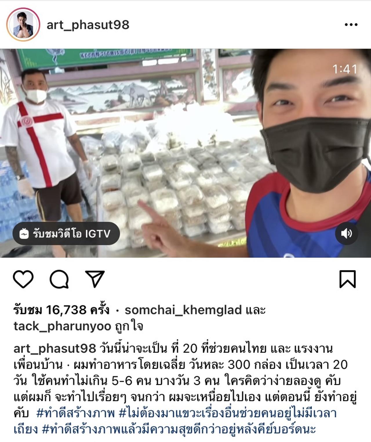และหลังจากสถานการณ์โควิดระบาดระลอกใหม่ หนุ่มอาร์ตได้ทำอาหารแจกจ่ายช่วยเหลือคนไทย และแรงงานเพื่อนบ้านมาตลอด ล่าสุด อาร์ต พศุตม์ ได้โพสต์คลิปวิดีโอ ขณะเตรียมอาหารไปแจกจ่าย พร้อมแคปชั่นว่า
