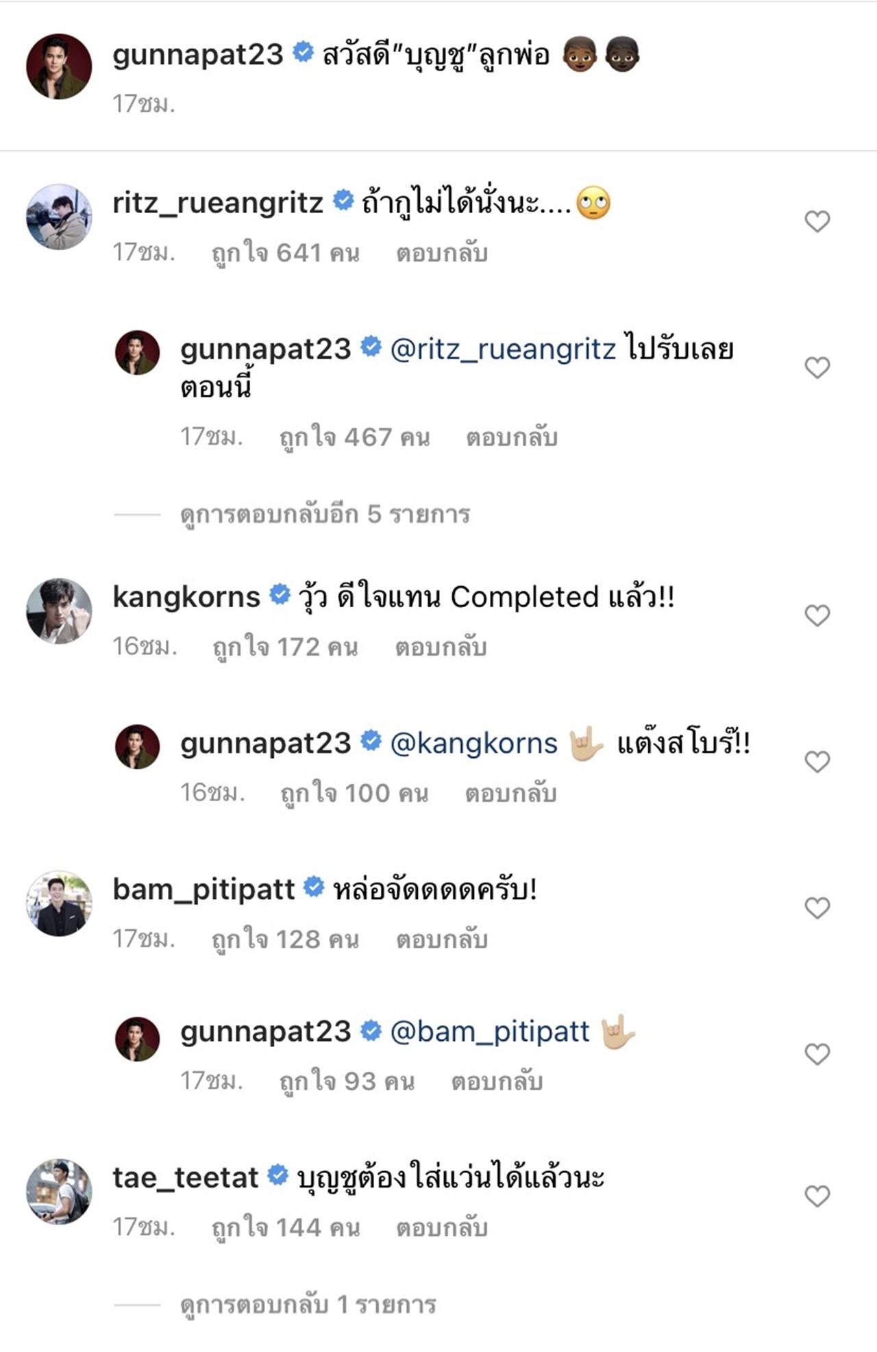 งานนี้เพื่อนในวงการ และแฟนคลับเข้ามาแสดงความยินดีกันเป็นจำนวนมาก อาทิ เพื่อนสนิทอย่างหนุ่ม ริท เรืองฤทธิ์ ศิริพานิช ที่เข้ามาคอมเมนต์ว่า "ถ้า_ูไม่ได้นั่งนะ...." หนุ่มกันก็รีบคอมเมนต์กลับทันทีว่า "ไปรับเลยตอนนี้" อีกด้วย