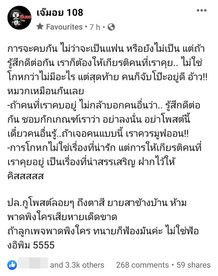 โดย เจ๊มอย 108 โพสต์ข้อความเกี่ยวกับเรื่องนี้ไว้ว่า “การจะคบกัน ไม่ว่าจะเป็นแฟน หรือยังไม่เป็น แต่ถ้ารู้สึกดีต่อกัน เราก็ต้องให้เกียรติคนที่เราคุย.. ไม่ใช่โกหกว่าไม่มีอะไร แต่สุดท้าย คนก็จับโป๊ะอยู่ดี อ้าว!! หมวกเหมือนกันเลย