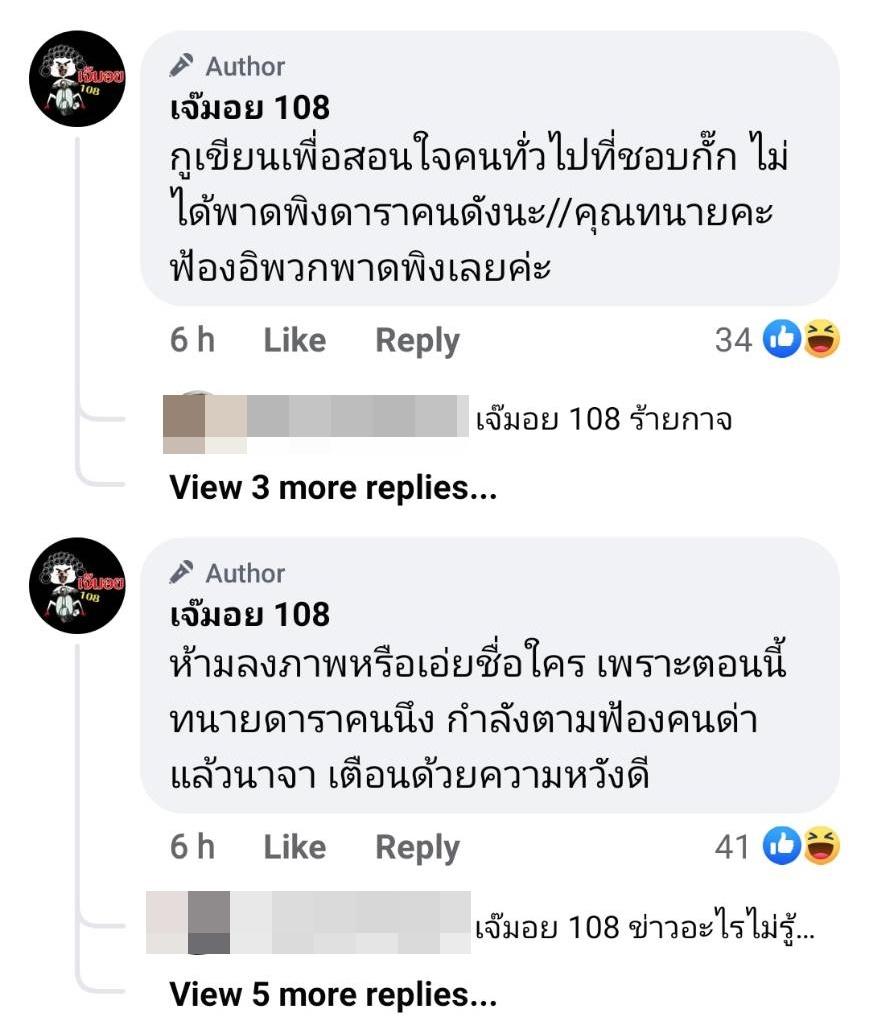 อีกทั้งยังเขียนในคอมเมนต์เพิ่มเติมว่า “กูเขียนเพื่อสอนใจคนทั่วไปที่ชอบกั๊ก ไม่ได้พาดพิงดาราคนดังนะ//คุณทนายคะ ฟ้องอิพวกพาดพิงเลยค่ะ”, “ห้ามลงภาพหรือเอ่ยชื่อใคร เพราะตอนนี้ทนายดาราคนนึง กำลังตามฟ้องคนด่าแล้วนาจา เตือนด้วยความหวังดี” โดยมีชาวเน็ตเข้ามาคอมเมนต์แสดงความคิดเห็นเป็นจำนวนมาก.