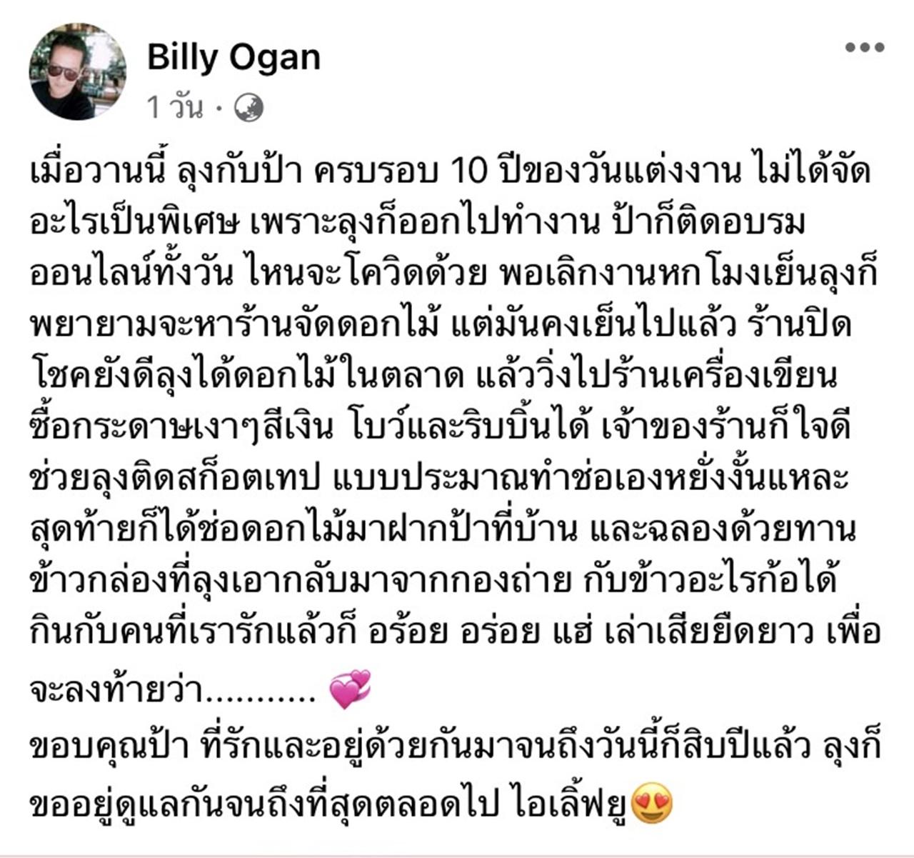 ฉลองครบรอบแต่งงาน 10 ปี แบบเรียบง่าย สำหรับ บิลลี่ โอแกน กับภรรยาสาวนอกวงการ น้ำฝน นันนภัส ไทยประเสริฐ โดยเจ้าตัวได้โพสต์ภาพ พร้อมกับรูป และเขียนถึงวันพิเศษที่ทำเซอร์ไพรส์ภรรยาอย่างเรียบง่าย ด้วยกันกินข้าวกล่องที่เอามาจากกองถ่าย และซื้อดอกไม้จากตลาด เพราะร้านดอกไม้ปิดแล้ว