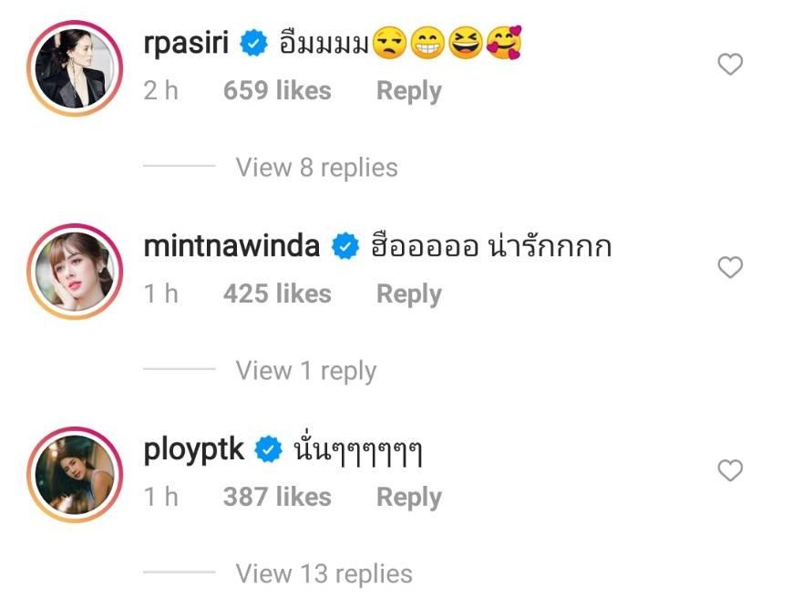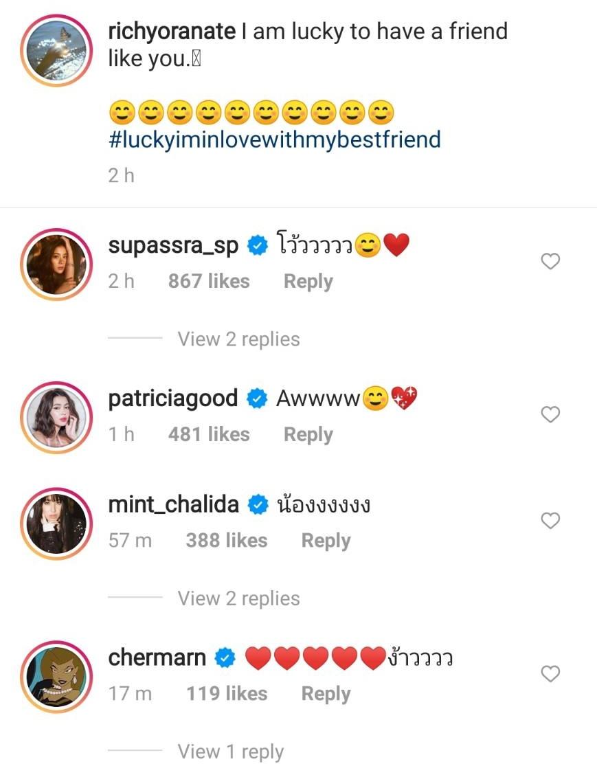 งานนี้หลังจากแฟนคลับ และเพื่อนๆ พี่ๆ ในวงการบันเทิงได้เห็นภาพแล้ว ก็เข้ามาเข้ามาแซวริชชี่กันเยอะมาก อาทิ พลอย เฌอมาลย์ “ง้าวววว”, มิ้นต์ ชลิดา “น้องงงงงง”, แพทริเซีย กู๊ด “Awwww”, เก้า สุภัสสรา "โว้ววววว” ฯลฯ เป็นอันว่าเปิดตัวชัดเจนทั้งคู่แถมยังเป็นอีกหนึ่งคู่ที่น่ารักมากๆ จ้า.