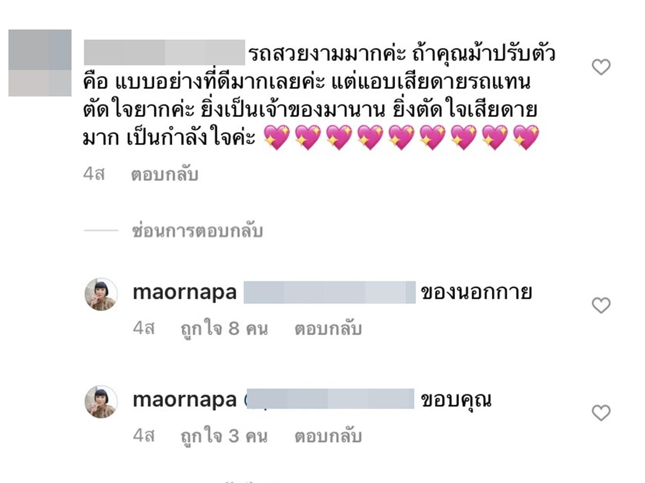 "รถสวยงามมากค่ะ ถ้าคุณม้าปรับตัวคือ แบบอย่างที่ดีมากเลยค่ะ แต่แอบเสียดายรถแทน ตัดใจยากค่ะ ยิ่งเป็นเจ้าของมานาน ยิ่งตัดใจเสียดายมาก เป็นกำลังใจให้ค่ะ" ซึ่งงานนี้เจ้าตัวได้มาตอบเพียงว่า "ของนอกกาย ขอบคุณ"