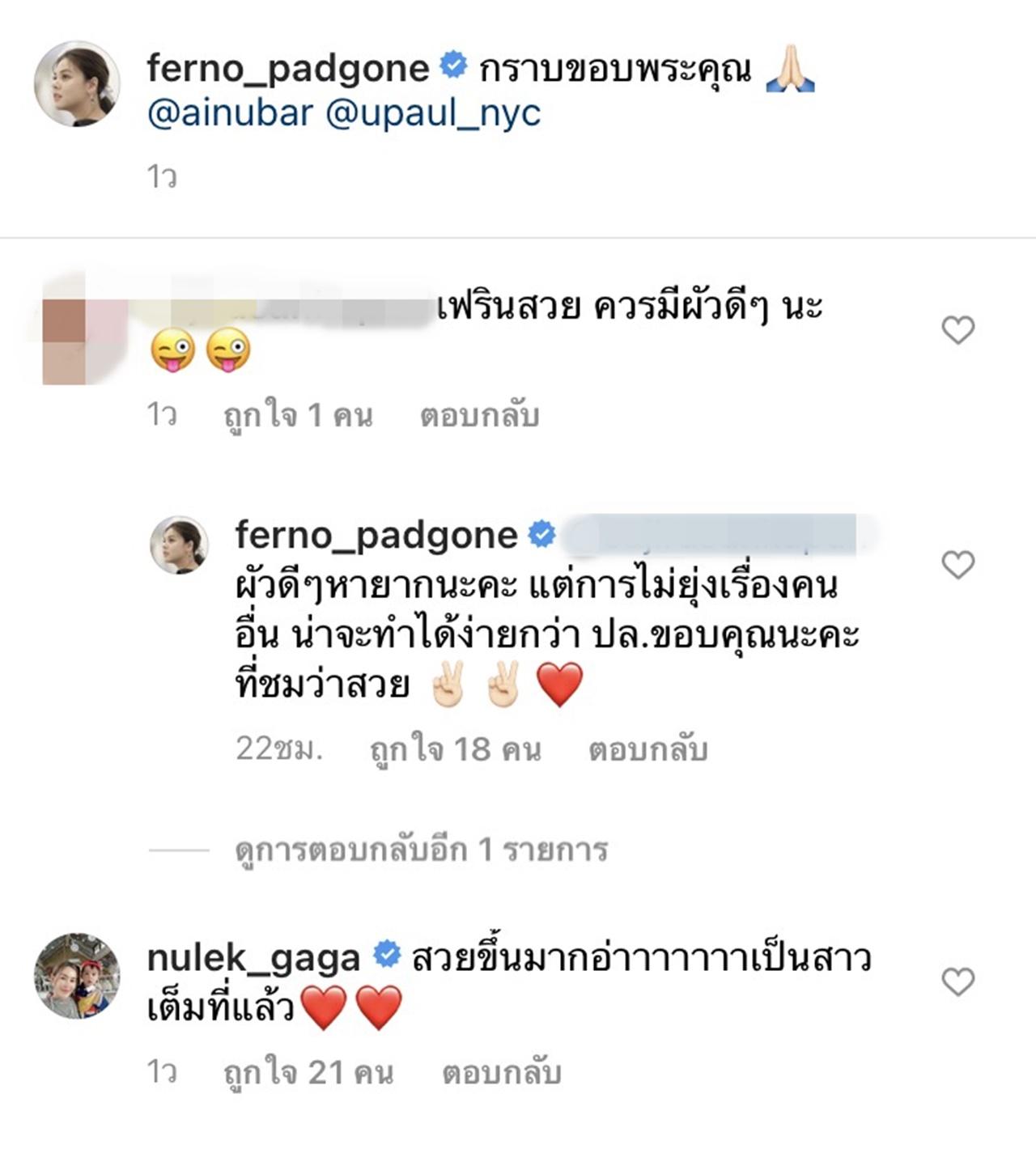 ซึ่งทำเอา ใบเฟิร์น รู้สึกปล่อยผ่านให้ไม่ได้ เจ้าตัวก็รีบตอบกลับทันที "ผัวดีๆหายากนะคะ แต่การไม่ยุ่งเรื่องคนอื่น น่าจะทำได้ง่ายกว่า ปล.ขอบคุณนะคะที่ชมว่าสวย".