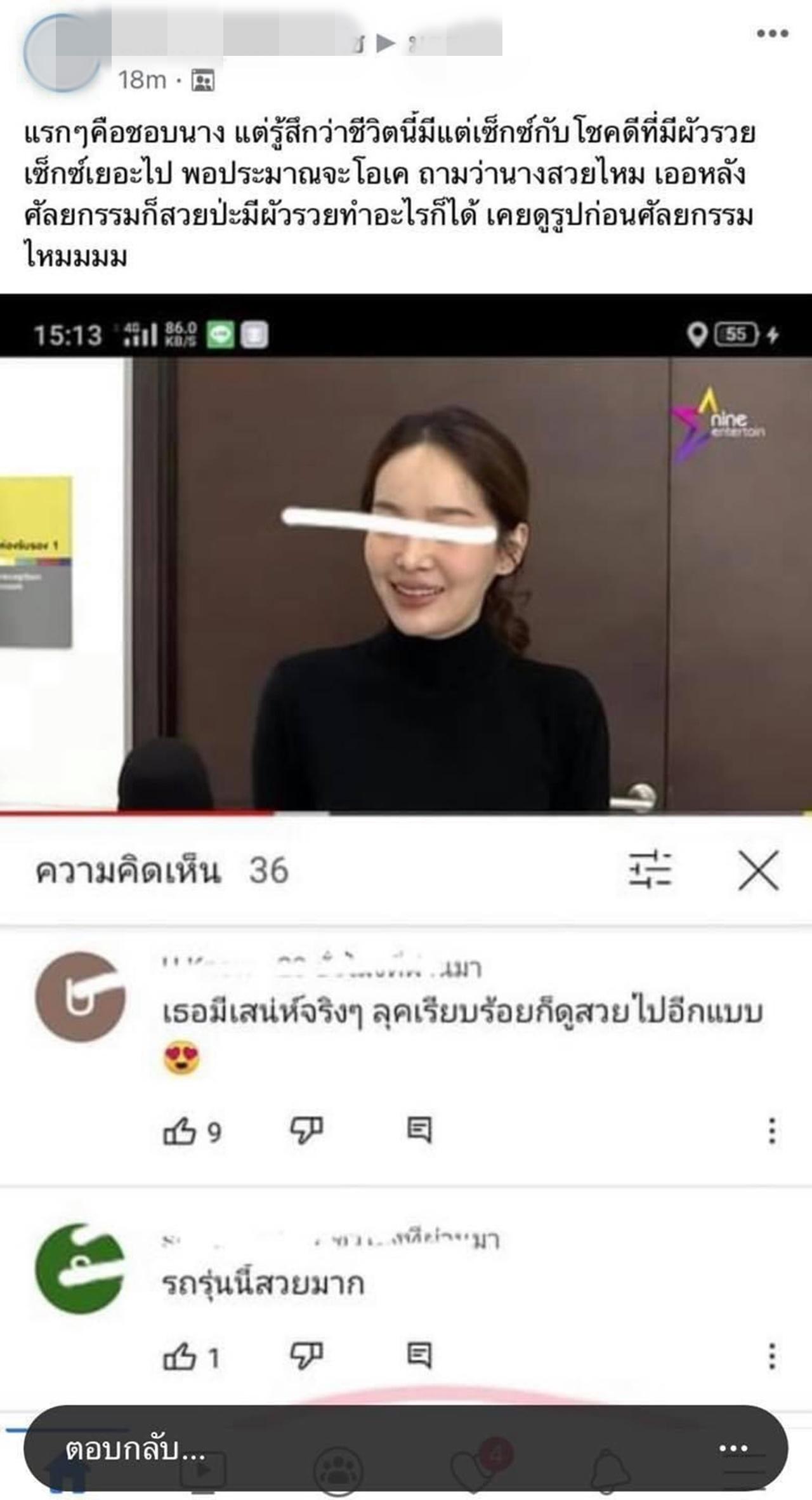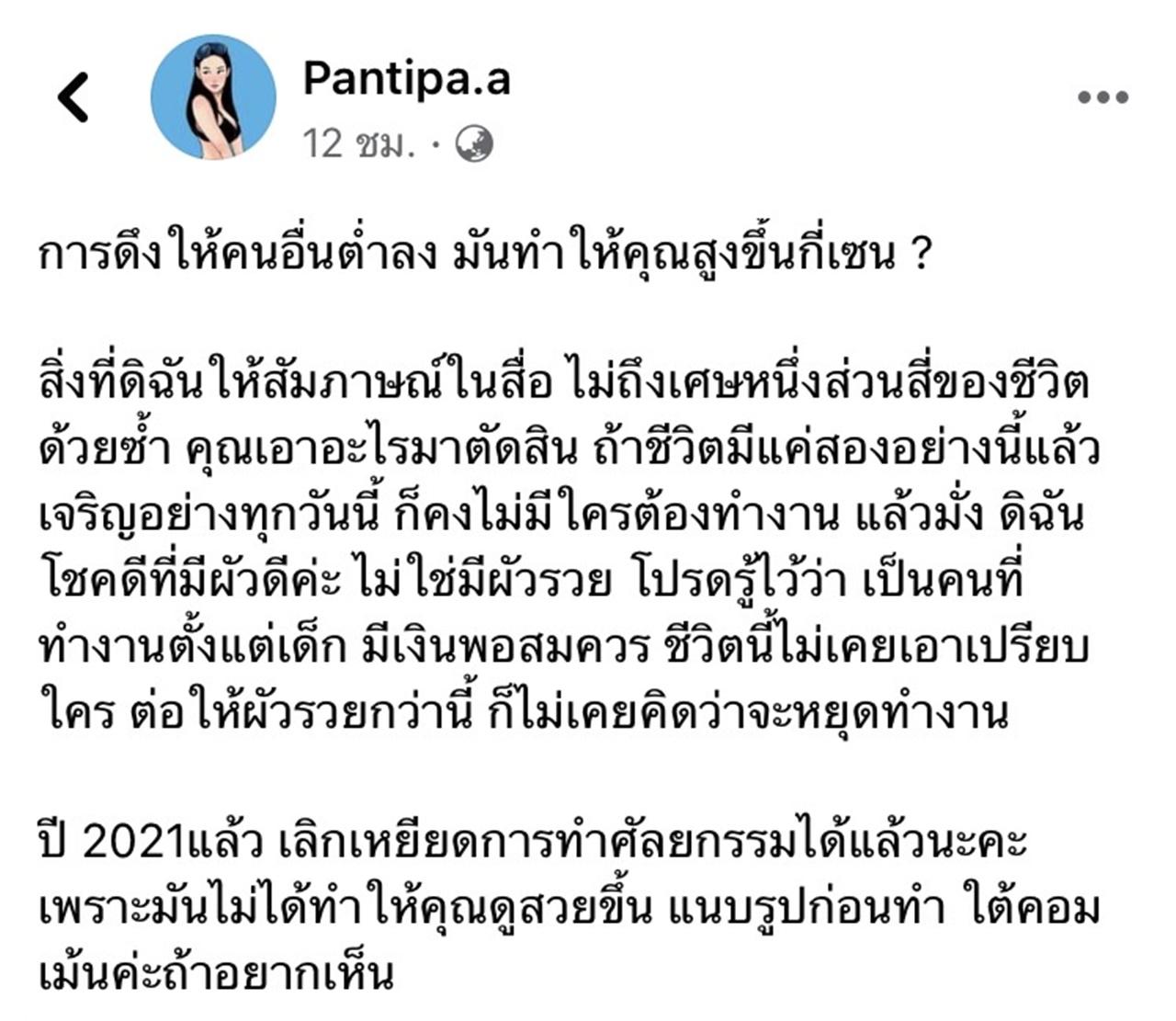 โดยในโพสต์นั้นได้เขียนว่า "แรกๆ คือชอบนาง แต่รู้สึกว่าชีวิตนี้มีแต่เซ็กซ์กับโชคดีที่มีผัวรวย เซ็กซ์เยอะไป พอประมาณจะโอเค ถามว่า นางสวยไหม เออหลังศัลยกรรมก็สวยปะ มีผัวรวยทำอะไรก็ได้ เคยดูรูปก่อนศัลยกรรมไหม"