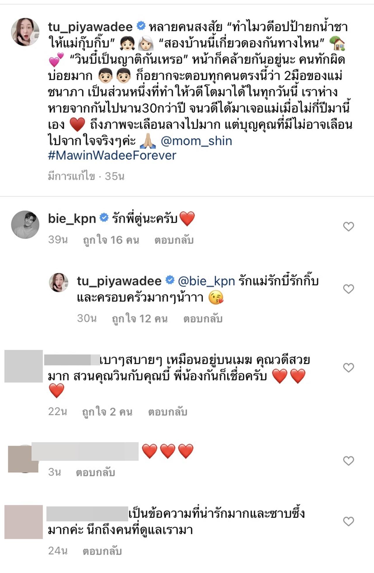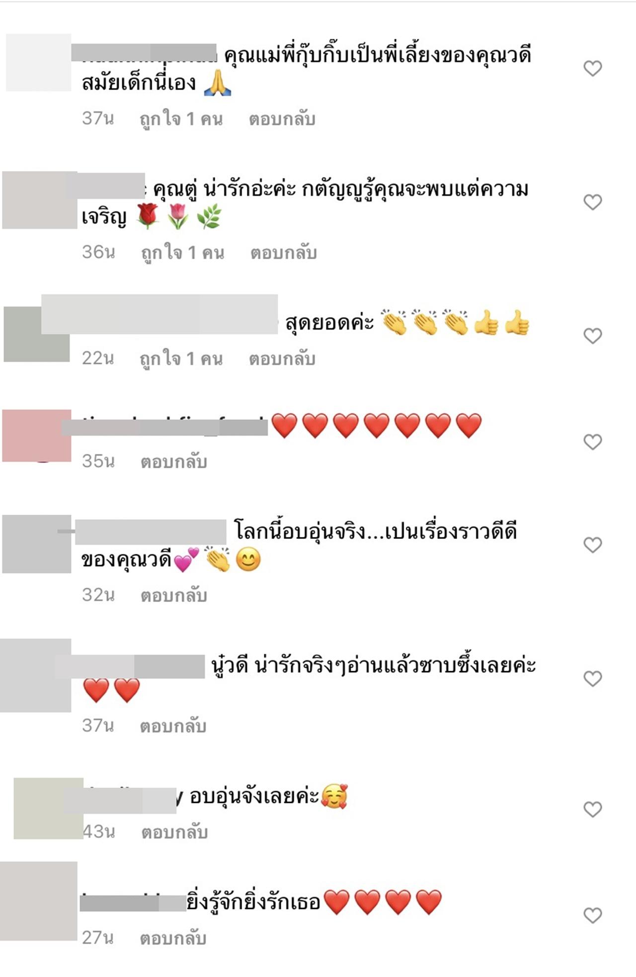"เป็นข้อความที่น่ารักมากและซาบซึ้งมากค่ะ นึกถึงคนที่ดูแลเรามา, คุณแม่พี่กุ๊บกิ๊บเป็นพี่เลี้ยงของคุณวดีสมัยเด็กนี่เอง, คุณตู่ น่ารักอ่ะค่ะ กตัญญูรู้คุณจะพบแต่ความเจริญ"