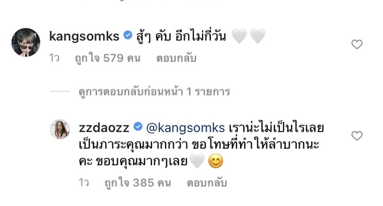 หลังจากที่เจ้าตัวโพสต์รูป และรีวิวความน่ารักของแฟนหนุ่มไปแล้ว ก็มีแฟนๆ เพื่อนๆ ในวงการเข้ามาคอมเมนต์แซว รวมไปถึงหนุ่มแกงส้มหวานใจสุดน่ารักก็ได้มาคอมเมนต์ถึงแฟนสาวว่า "สู้ๆ คับ อีกไม่กี่วัน" ซึ่งดาวโอเกะ ก็ได้มาตอบว่า "เราน่ะไม่เป็นไรเลย เป็นภาระคุณมากกว่า ขอโทษที่ทำให้ลำบากนะคะ ขอบคุณมากๆ เลย"