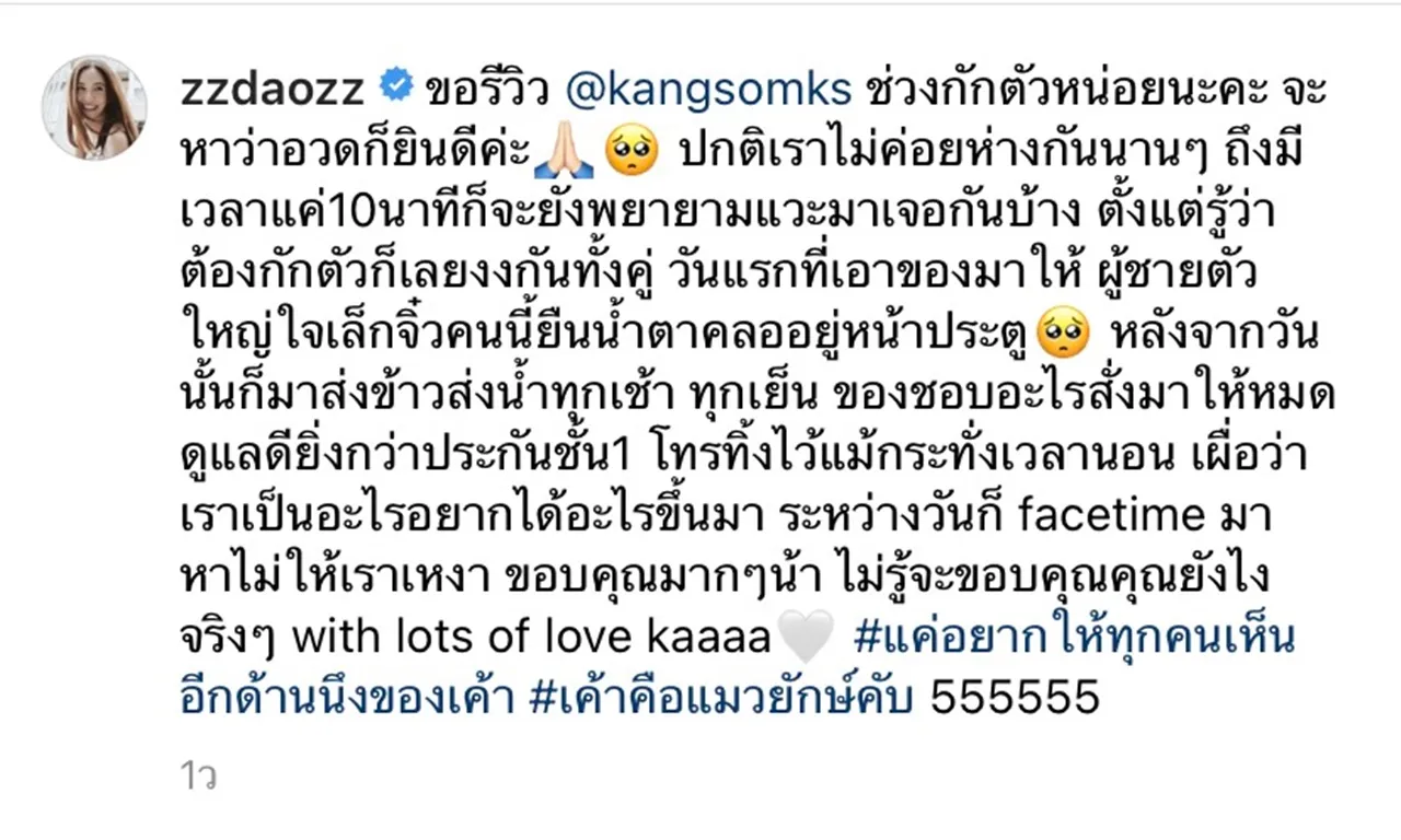 "ขอรีวิว @kangsomks ช่วงกักตัวหน่อยนะคะ จะหาว่าอวดก็ยินดีค่ะ ปกติเราไม่ค่อยห่างกันนานๆ ถึงมีเวลาแค่ 10 นาที ก็จะยังพยายามแวะมาเจอกันบ้าง ตั้งแต่รู้ว่าต้องกักตัวก็เลยงงกันทั้งคู่ วันแรกที่เอาของมาให้ ผู้ชายตัวใหญ่ใจเล็กจิ๋วคนนี้ยืนน้ำตาคลออยู่หน้าประตู