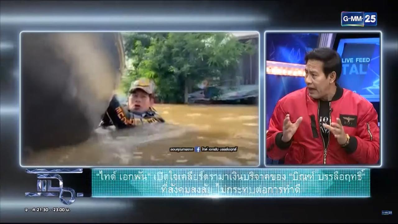 จากนั้นไทด์เล่าย้อนกลับไปถึงดราม่ารับบริจาคเงินช่วยน้ำท่วมที่ภาคอีสาน 422 ล้านบาท ที่หาว่าไม่ทำบัญชีชี้แจง โดยไทด์บอกว่า คุณบิณฑ์แถลงไป 2 ครั้งแล้ว โดยมีเอกสารชี้แจงลังใหญ่เกือบ 50 ลัง ชี้แจงว่า 400 กว่าล้านเอาไปทำอะไรบ้าง โดยมี 3 โครงการ คือ 1.โครงการเยียวยาครอบครัวละ 5,000 บาท ที่ได้รับผลกระทบจากน้ำท่วมที่ จ.ร้อยเอ็ด จ.ยโสธร จ.อำนาจเจริญ จ.มหาสารคาม จ.ขอนแก่น จ.อุบลราชธานี จำนวนเกือบ 70,000 ครอบครัว รวมเป็นเงิน 300 กว่าล้านบาท