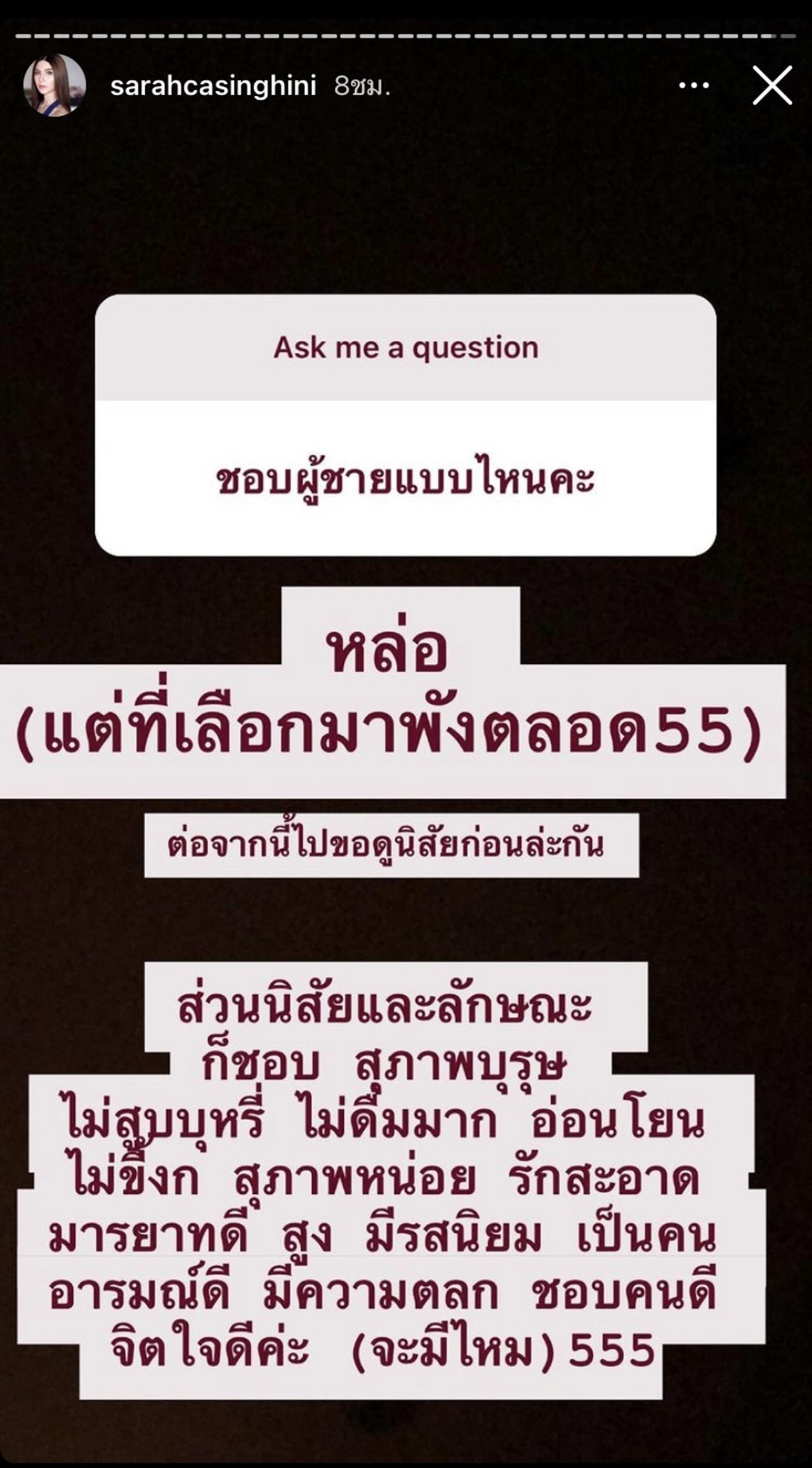 เป็นคนที่ชอบเล่นถามตอบกับแฟนๆ อยู่เสมอๆ สำหรับคุณแม่ลูกสองคนสวย ซาร่า คาซิงกินี ที่ล่าสุด ได้เล่นถามตอบกับแฟนๆ ของเธอผ่านทางไอจีสตอรี่ ซึ่งเจ้าตัวได้เลือกคำถามที่แฟนๆ ถามเข้ามาว่า "ชอบผู้ชายแบบไหนคะ"