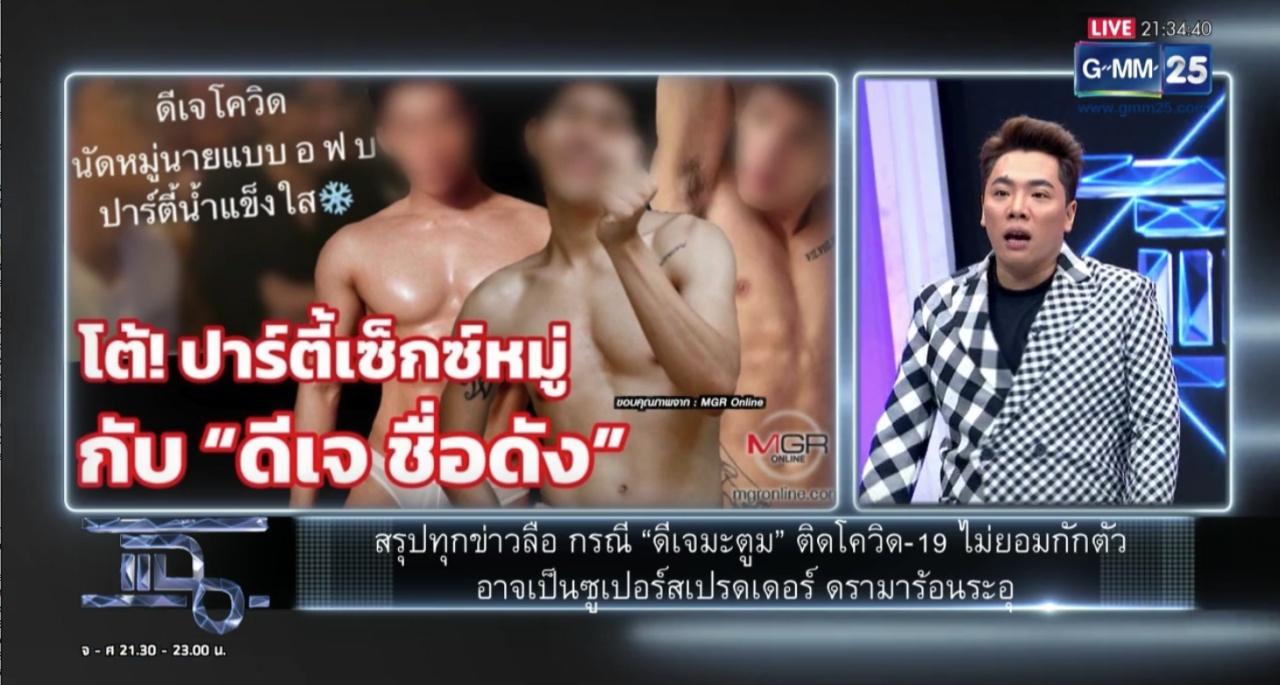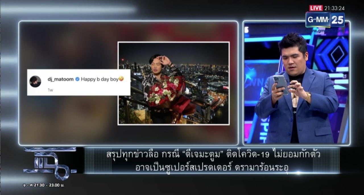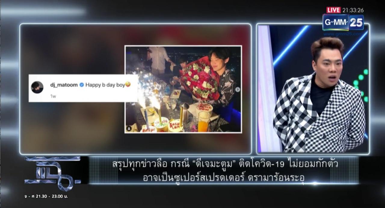 โดย มดดำ เผยว่า "วันนี้หลายคนคงรอฟังเรื่องมะตูม ตอนนี้คนที่เกี่ยวข้องกับมะตูมและติดโควิด ถ้านับแล้วตอนนี้มี 19 คน ที่ ศบค.เขาประกาศมา จะเล่าให้ฟังอย่างนี้ว่า มะตูม จัดงานวันเกิดเมื่อวันที่ 9 มกราคม เซอร์ไพรส์ปาร์ตี้ จริงๆ ไม่ใช่วันเกิดหรอก วันเกิดนานกว่านี้ แล้วปรากฏว่าก่อนหน้านี้คนที่ไปร่วมงานวันเกิดมะตูม ไปผับที่เชียงใหม่มา ช่วงปีใหม่ วันที่ 9 ไม่รู้ว่าตามข่าวมีการบอกว่ามีเซ็กซ์ มีการเรียกเด็กนายแบบมา