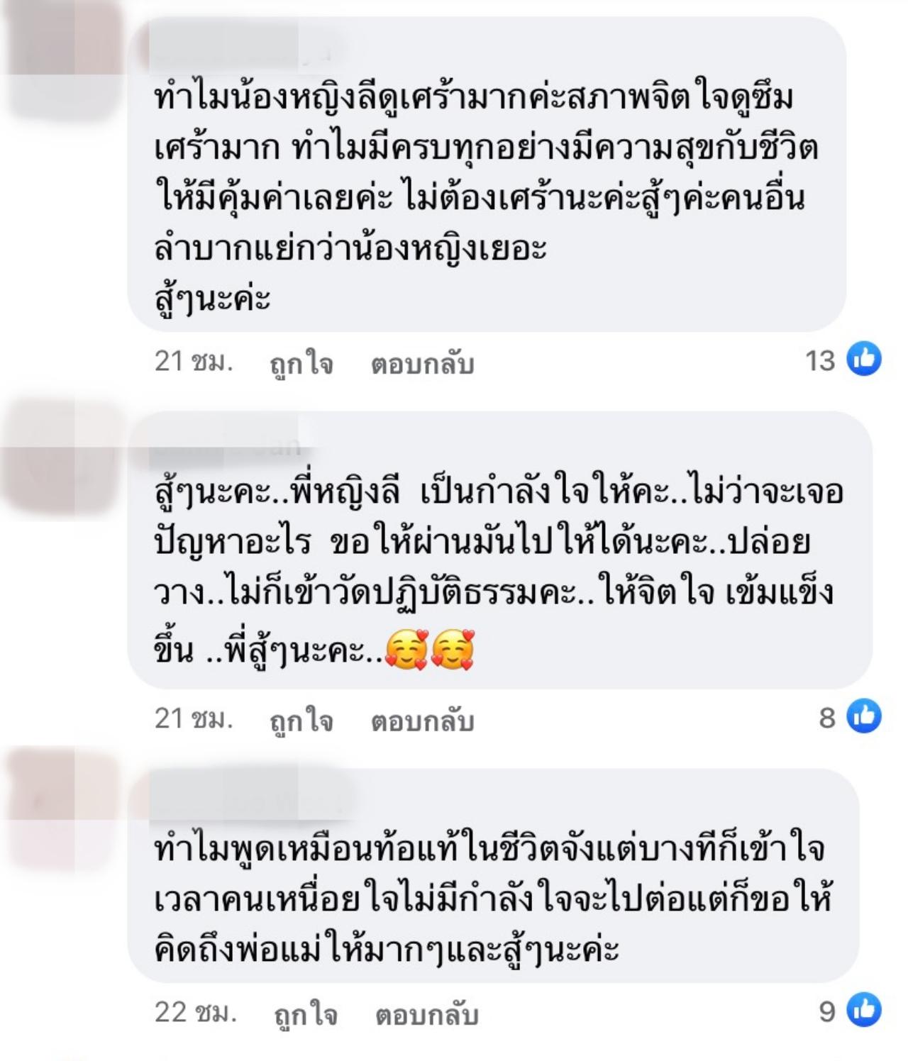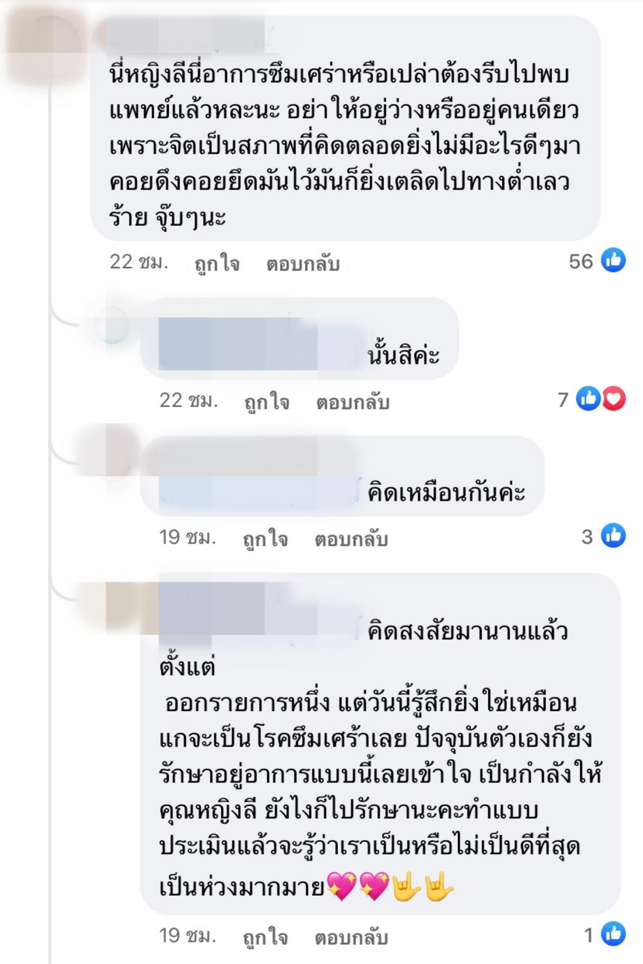 “คิดสงสัยมานานแล้วตั้งแต่ออกรายการหนึ่ง แต่วันนี้รู้สึกยิ่งใช่เหมือนแกจะเป็นโรคซึมเศร้าเลย ปัจจุบันตัวเองก็ยังรักษาอยู่ อาการแบบนี้เลยเข้าใจ เป็นกำลังใจให้คุณหญิงลี ยังไงก็ไปรักษานะคะ ทำแบบประเมินแล้วจะรู้ว่าเราเป็นหรือไม่เป็นดีที่สุด เป็นห่วงมากมาย”.