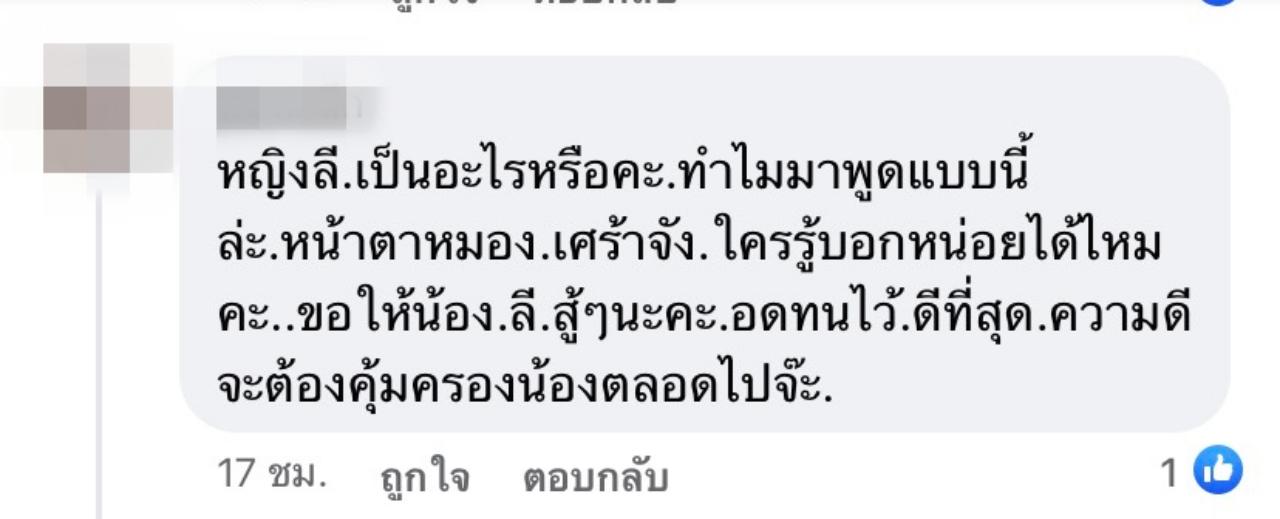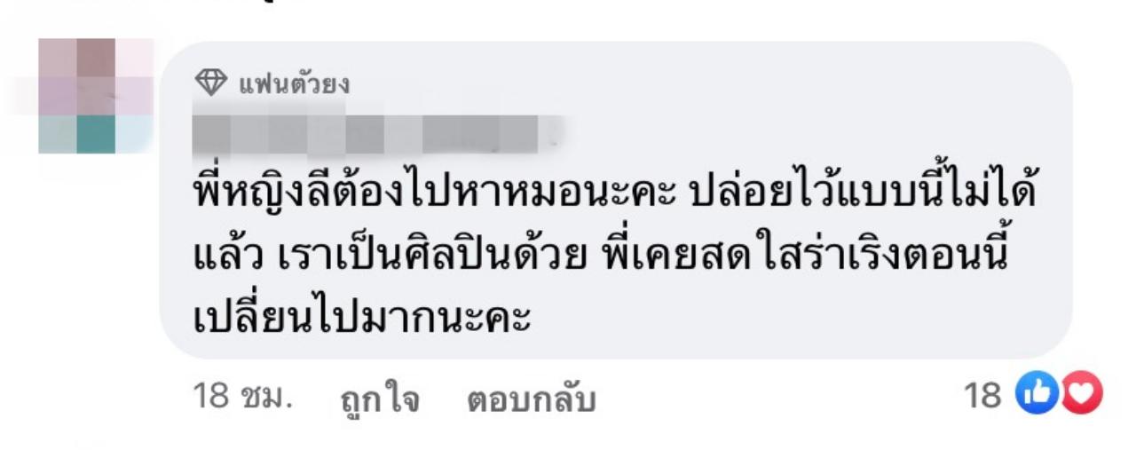 ซึ่งแต่ละคนก็ได้โพสต์แสดงความเป็นห่วง หญิงลี ศรีจุมพล มากมาย โดยบอกว่า “พี่หญิงลีต้องไปหาหมอนะคะ ปล่อยไว้แบบนี้ไม่ได้แล้ว เราเป็นศิลปินด้วย พี่เคยสดใสร่าเริง ตอนนี้เปลี่ยนไปมากนะคะ”