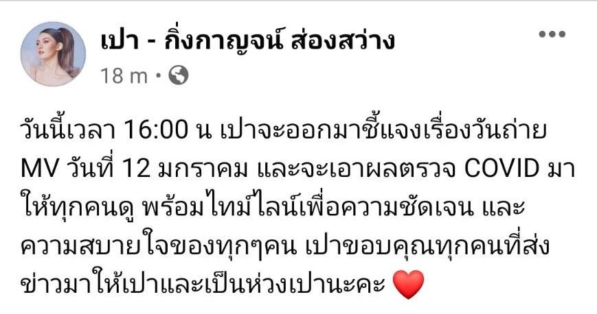ล่าสุด เปา กิ่งกาญจน์ ได้โพสต์ถึงเรื่องดังกล่าวผ่านทางแฟนเพจ โดยบอกว่า “วันนี้เวลา 16:00 น. เปาจะออกมาชี้แจงเรื่องวันถ่าย MV วันที่ 12 มกราคม และจะเอาผลตรวจ COVID มาให้ทุกคนดู พร้อมไทม์ไลน์เพื่อความชัดเจน และความสบายใจของทุกๆ คน เปาขอบคุณทุกคนที่ส่งข่าวมาให้เปาและเป็นห่วงเปานะคะ”